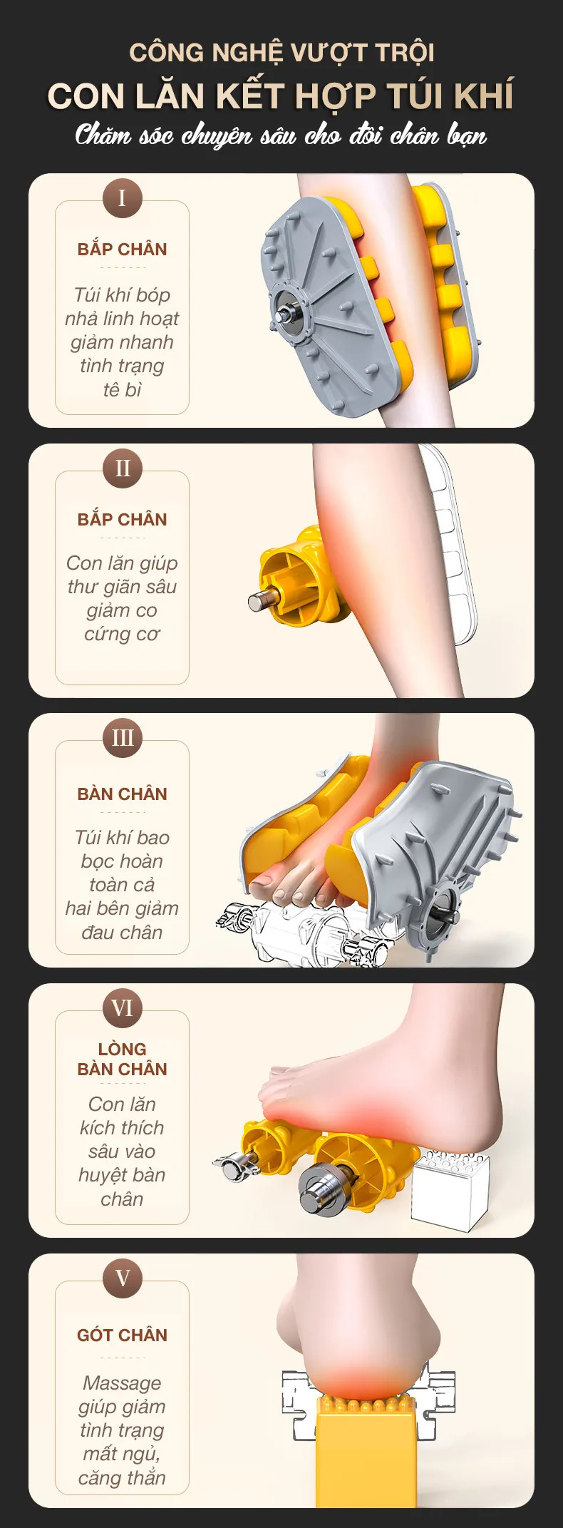 Với công nghệ con lăn 4D hiện đại và túi khí thông minh, thực hiện các động tác massage đa dạng như xoa bóp, nhào nặn, ấn huyệt, Cùng với túi khí được trải dài từ bắp chân đến gót chân bóp nhả liên tục, giúp giảm đau nhức và cải thiện tuần hoàn máu, giảm tê bì chân, mang lại cảm giác thoải mái và sảng khoái.