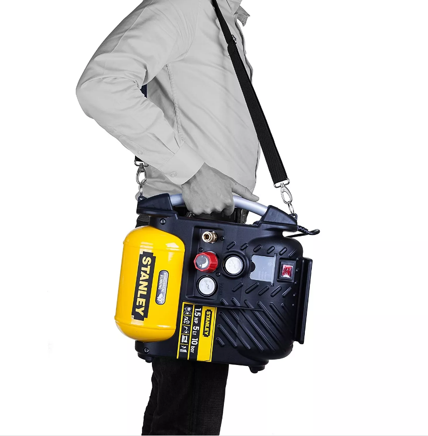 Máy nén khí Stanley được trang bị đồng hồ đo áp suất giúp người dùng dễ quan sát. Máy còn có thêm quai xách để di chuyển bằng tay.