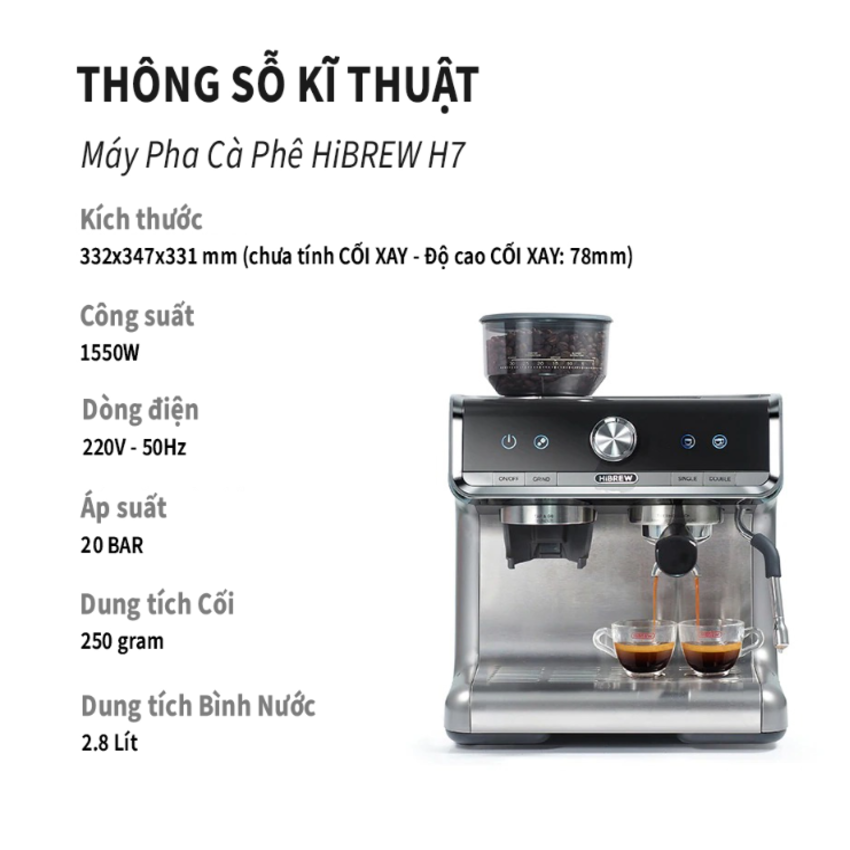 - Máy pha cà phê Espresso chuyên nghiệp 3 trong 1 HiBREW CM5020 có công suất hoạt động là 1550W, áp suất 20 bar cho phép pha tối đa 40 - 50 ly/ngày. Nhờ đó đáp ứng được nhu cầu sử dụng tại các văn phòng, quán cà phê, khách sạ Công nghệ xay cảm biến hiện đại