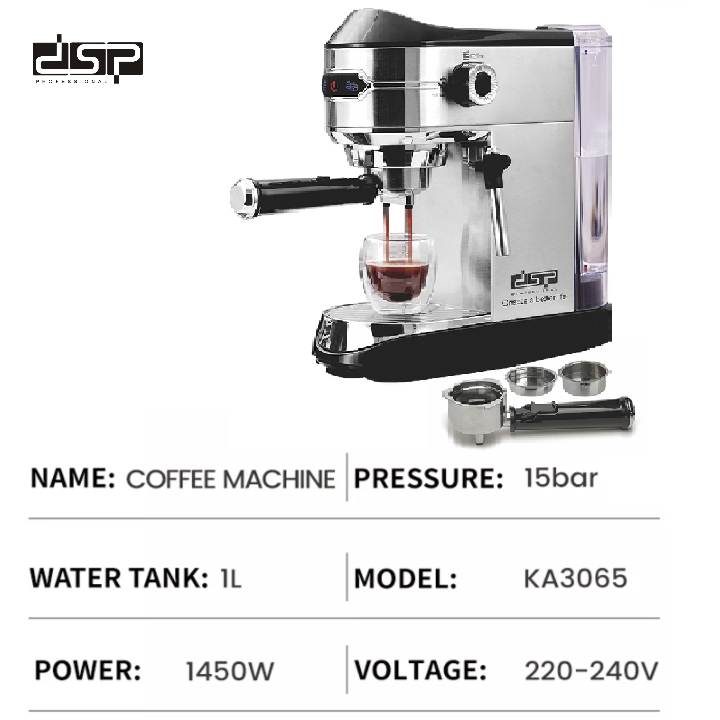 Mua tại TiktokMáy pha cà phê Espresso nhãn hiệu DSP KA3065 - Áp suất 15 bar, có công suất hoạt động mạnh mẽ lên đến 1450W - HÀNG NHẬP KHẨU Thiết kế nhỏ gọn, hiện đại