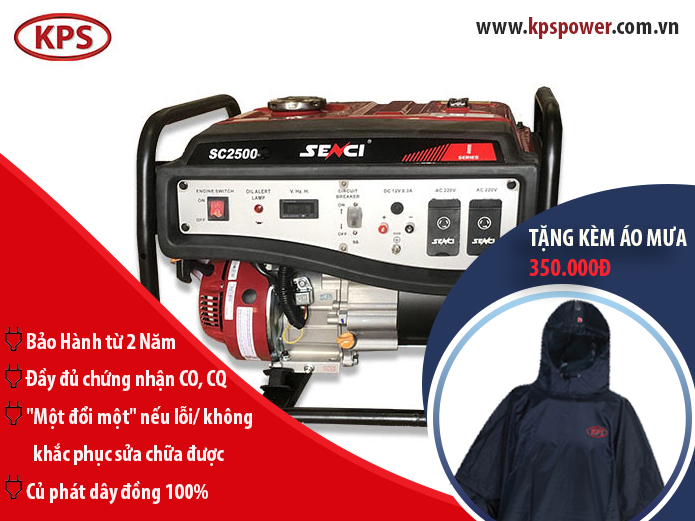 1. Máy phát điện Senci SC2500 – 2.5KW - Senci là dòng máy phát điện hiện đã có mặt trên 120 quốc gia, được các thị trường khó tính như Nhật Bản, Châu Âu, Mỹ, Nga, Trung Quốc, Úc ưa chuộng. Sản phẩm đạt tiêu chuẩn ISO 9001:2008 (Chứng chỉ tiêu chuẩn chất lượng), CE (Chứng chỉ tuân theo pháp luật của liên minh châu Âu), CARB (Tiêu chuẩn về khí thải của Mỹ), Rohs (Tiêu chuẩn về hạn chế các chất độc hại của liên minh châu Âu).