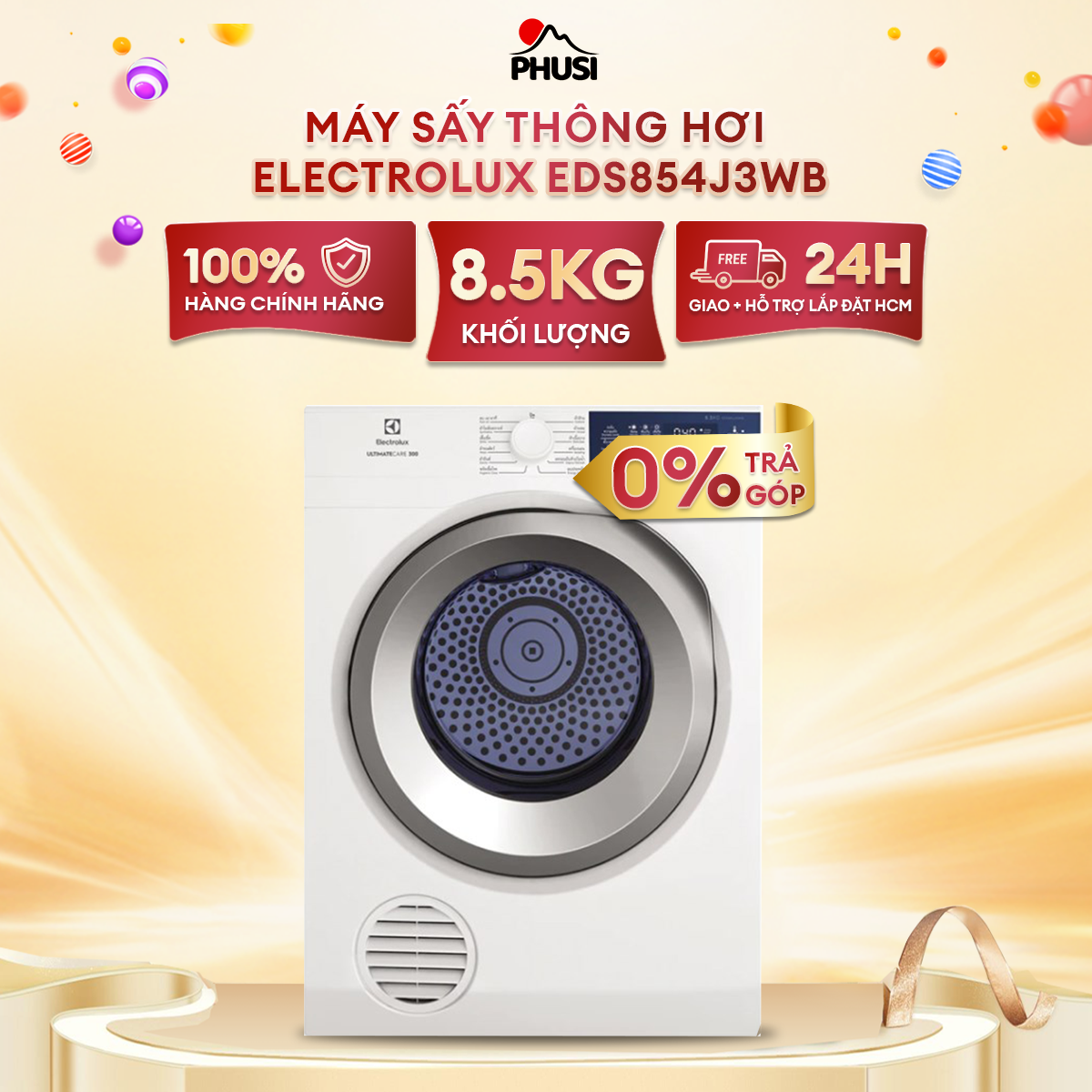 Thông số kỹ thuật Máy sấy quần áo Electrolux 8.5 kg EDS854J3WB Trắng Đặc điểm sản phẩm Model: EDV854J3WB Màu sắc: Trắng Nhà sản xuất: Electrolux Xuất xứ: Thái Lan Thời gian bảo hành: 24