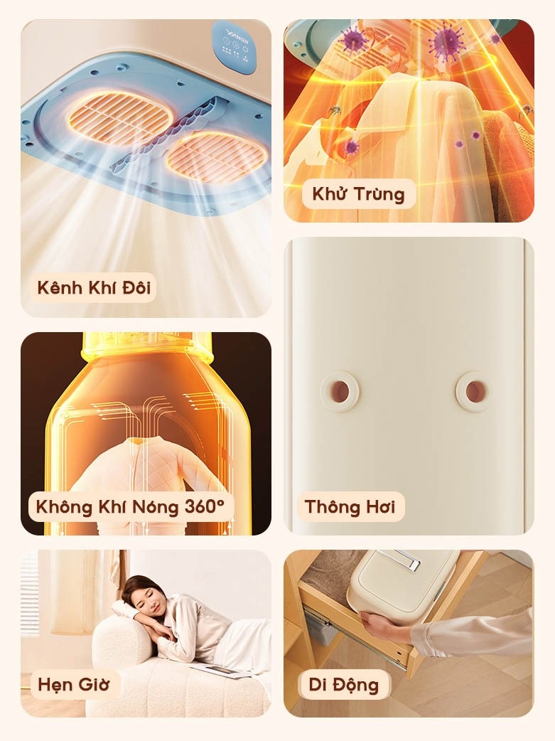 Sấy nhanh, Diệt khuẩn và mạt. Hai chế độ làm nóng PTC và gió nóng tuần hoàn 360° Thiết kế nhỏ, thuận lợi nhưng hiệu suất sấy cao. Có đèn UV để diệt khuẩn đạt