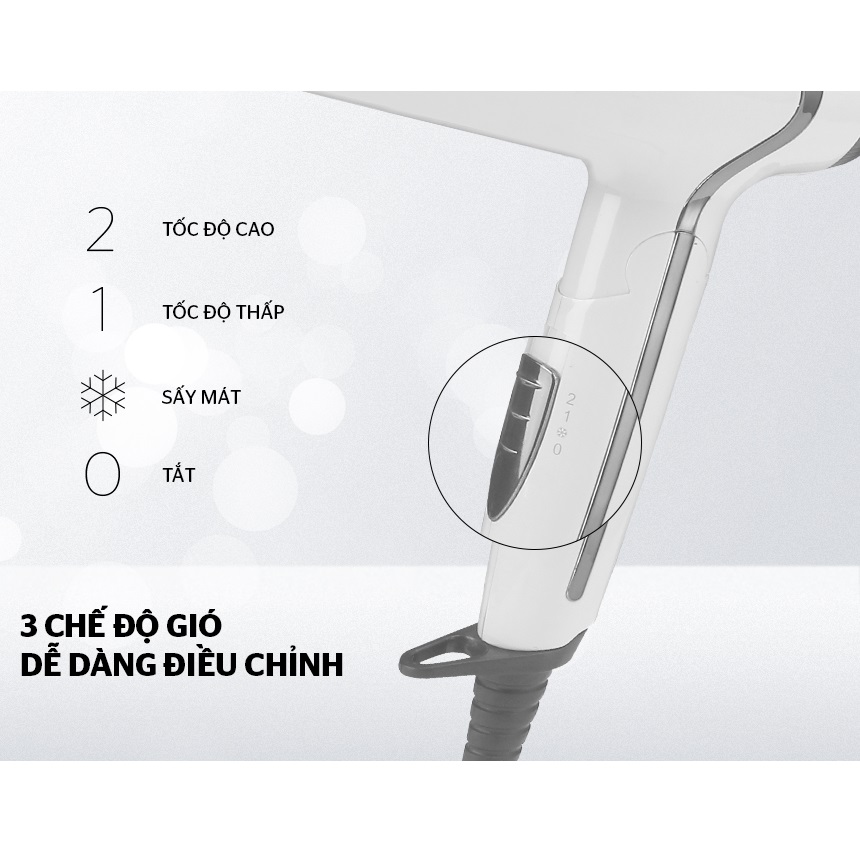 - Công suất mạnh mẽ, sấy tóc nhanh Máy sấy sử dụng công suất 1500W với 2 tốc độ - 3 mức nhiệt khác nhau giúp sấy tóc nhanh khô; tiết kiệm thời gian, điện năng và công suất. Bạn có thể tùy chỉnh chế độ sấy khô hoặc sấy mát bảo vệ tóc bằng cách trượt/gạt nhẹ công tắc trên tay cầm, vô cùng tiện dụng và dễ dàng. Máy sấy có chức năng thổi gió mát, giúp bảo về tóc luôn mềm mượt tránh gấy hư tổn do tác động của nhiệt.