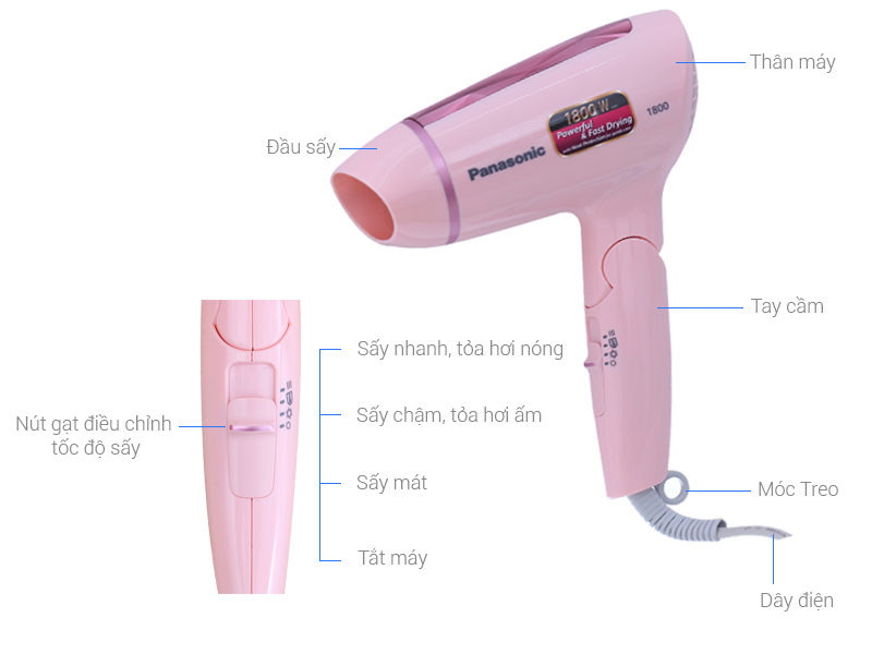 Máy sấy tóc Panasonic với thiết kế nhỏ gọn, dễ cầm nắm cùng công suất hoạt động mạnh mẽ 1800W giúp tóc nhanh khô, tiết kiệm thời gian sấy tóc Có 2 tốc độ