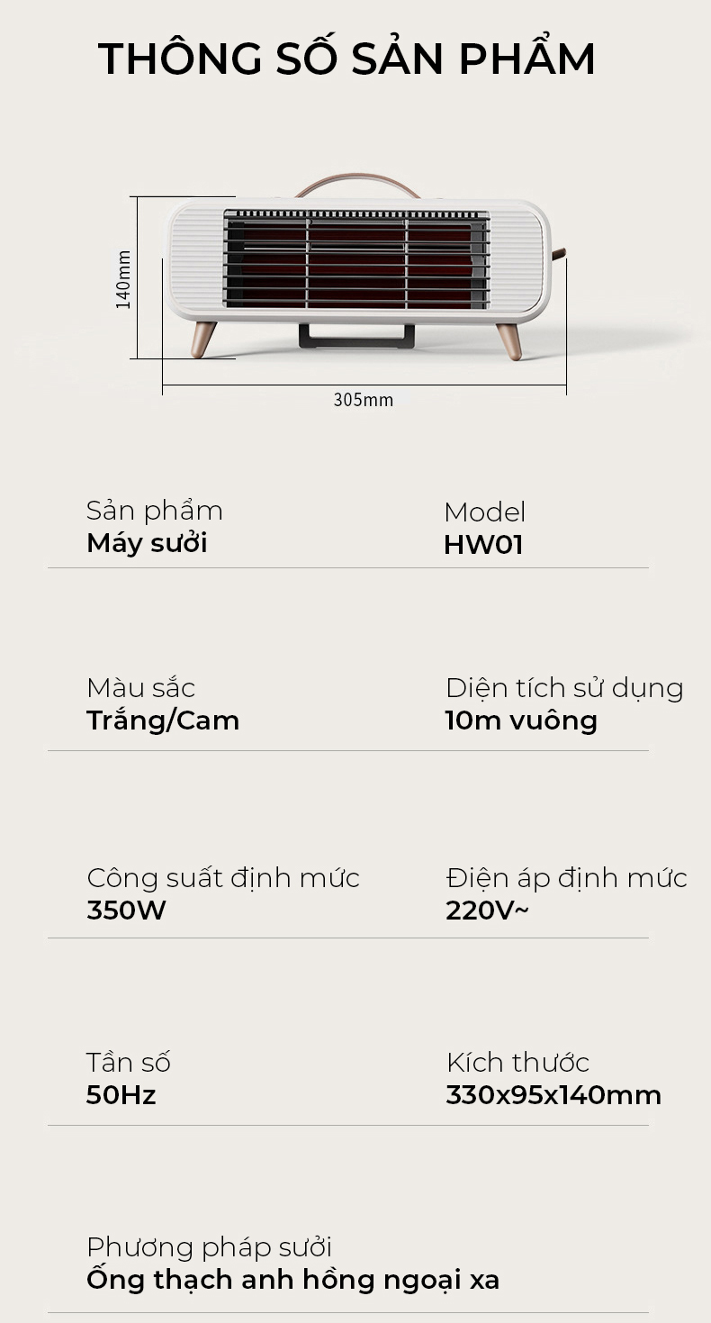 Thiết kế nhỏ gọn, tiện dụng Sưởi ấm nhanh, không gây tiếng ồn 3 mức phát nhiệt Có tính năng quay đảo hướng phát nhiệt, phạm vi phát nhiệt rộng Lưới tản nhiệt thiết kế