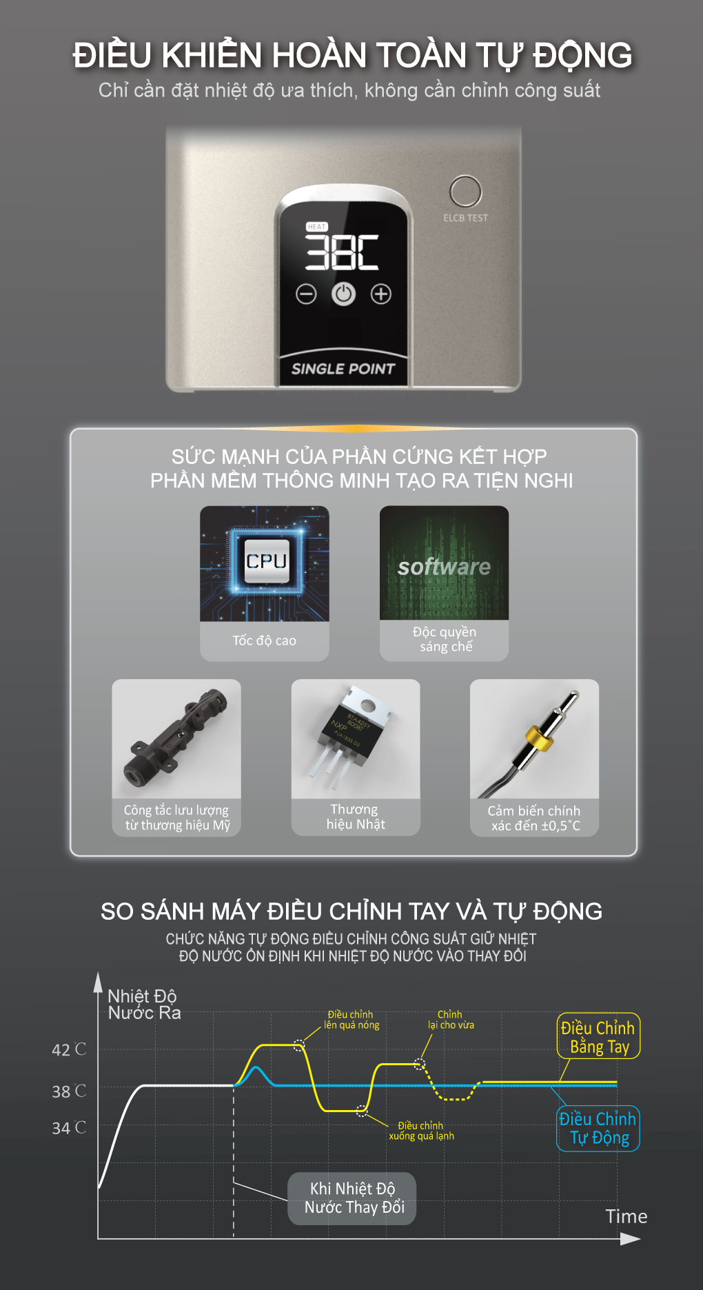 - Sản phẩm duy nhất tại Việt Nam sử dụng công nghệ tự động điều chỉnh công suất bằng cảm biến nhiệt và phần mềm tự học, KHÔNG cần dùng cảm biến lưu lượng. -
