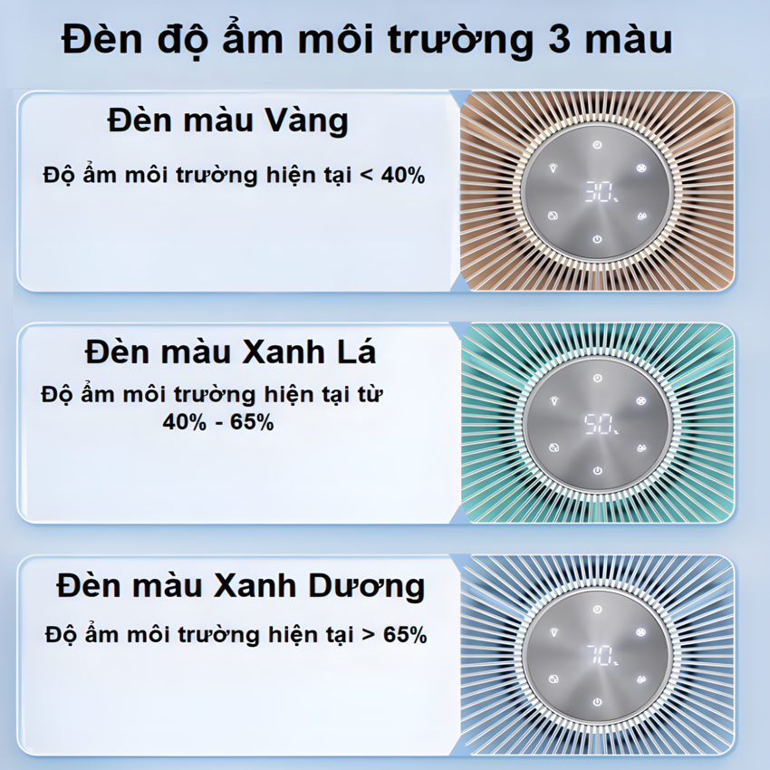 - Đèn màu Vàng độ ẩm môi trường nhỏ hơn 40%, Đèn màu Xanh Lá độ ẩm môi trường hiện tại từ 40% đến 65%, Đèn màu Xanh Dương độ ẩm môi trường hiện tại lớn hơn 65%. Hoạt động yên tĩnh