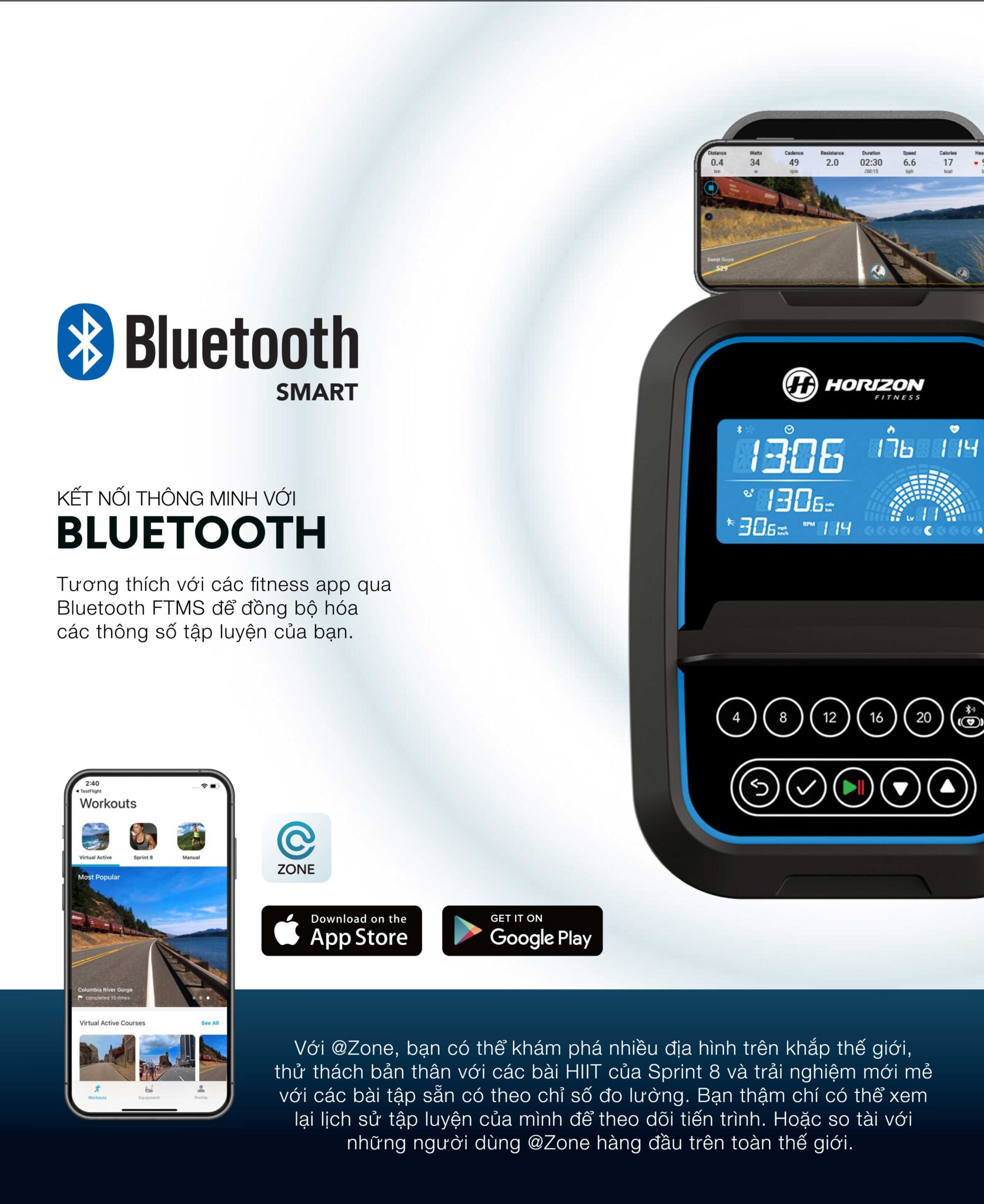 - Bluetooth kết nối THÔNG MINH với máy theo dõi nhịp tim và các ứng dụng SMART FITNESS phổ biến, giúp bớt nhàm chán khi tập luyện.