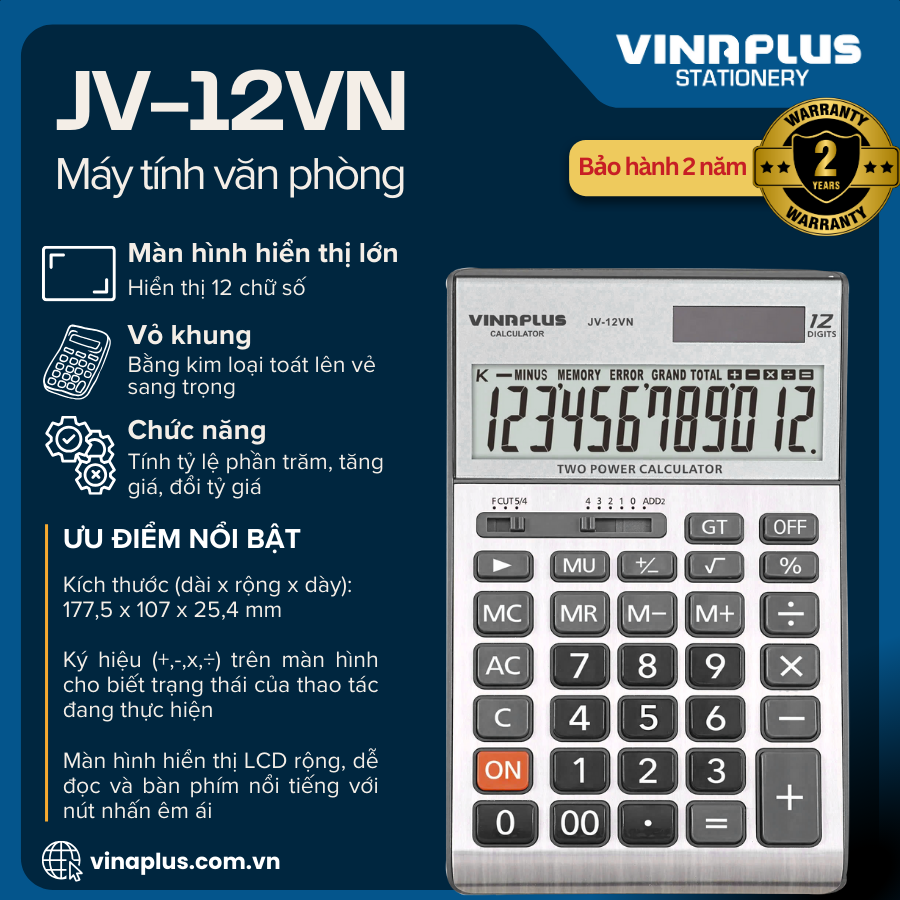 THÔNG TIN CHI TIẾT Tên sản phẩm: Máy tính JV-12VN Thương hiệu: VINAPLUS Model: JV-12VN Bảo hành: 2 năm Kích thước (dài x rộng x dày): 177,5 x 107 x 25,4 mm Hiển thị:12 số