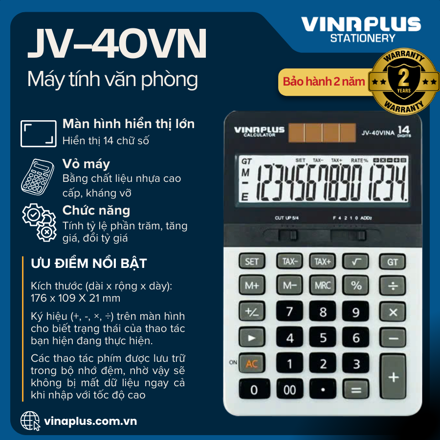 THÔNG TIN CHI TIẾT Tên sản phẩm: Máy tính JV-40VN Thương hiệu: VINAPLUS Model: JV-40VN Bảo hành: 2 năm Kích thước (dài x rộng x dày): 176 x 109 X 21 mm Hiển thị: 14