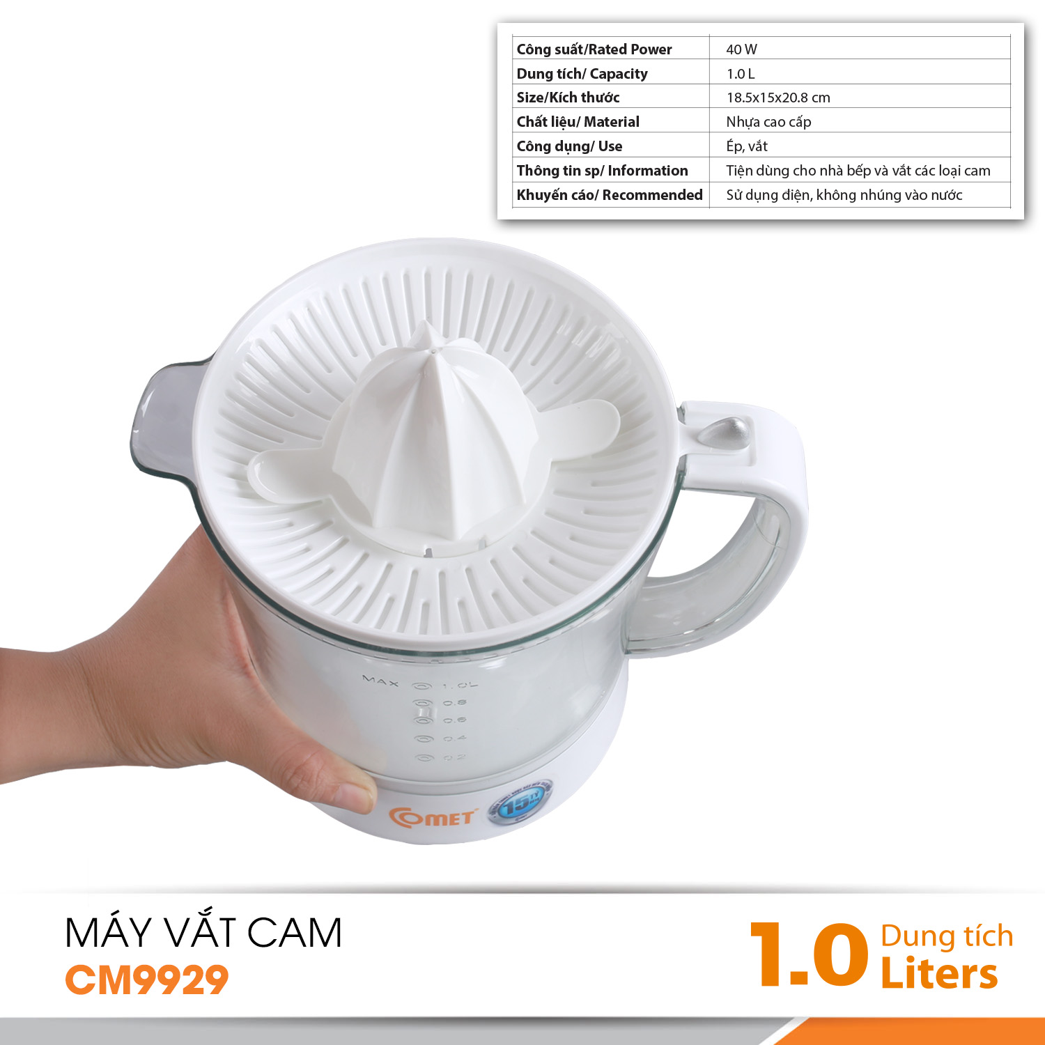 THÔNG TIN KỸ THUẬT: 1.Thương hiệu : Comet 2.Sản phẩm : Máy vắt cam 3.Mã sản phẩm : CM9929 4.Điện áp : 220V - 50Hz 5.Công suất: 40W 6.Dung tích: 1000ml 7.Kích thước : 185*150*208