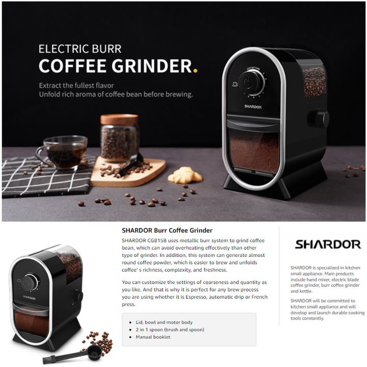 - Cà phê là thức uống yêu thích của nhiều người, nhưng tình trạng về đảm bảo an toàn vệ sinh thực phẩm khiến bạn ái ngại. Máy Xay Cà Phê Shardor CG815B sẽ hỗ trợ bạn có được những ly cà phê nguyên chất, thơm ngon và đảm bảo an toàn cho sức khỏe. Chỉ cần với những thoa tác đơn giản là bạn sẽ có ngay thành phẩm bột cà phê mịn thơm ngon. Chức năng định lượng cà phê