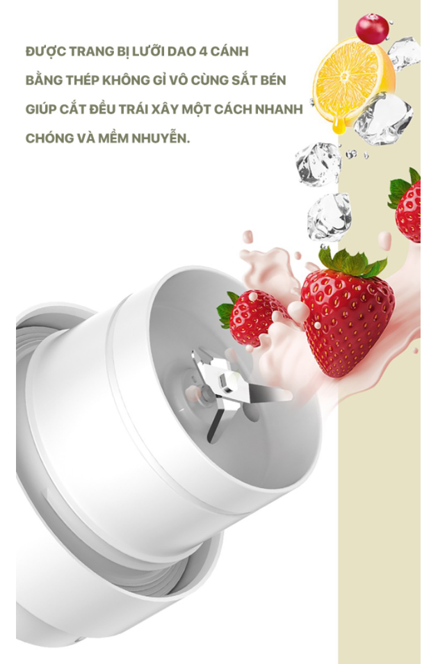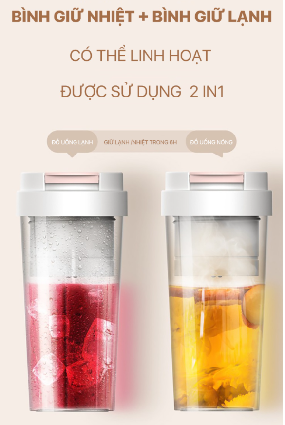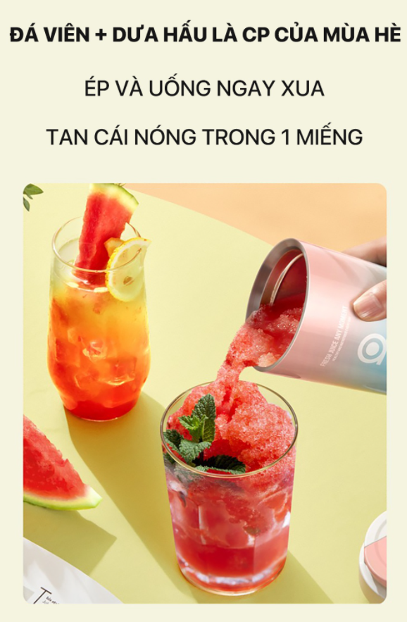 "* Nhỏ gọn với khối lượng 0.4kg, chỉ bằng 25 % so với máy ép bình thường, dung tích 350ml * Thiết kế cối xay kiêm bình nước di động, thuận tiện mang theo khi