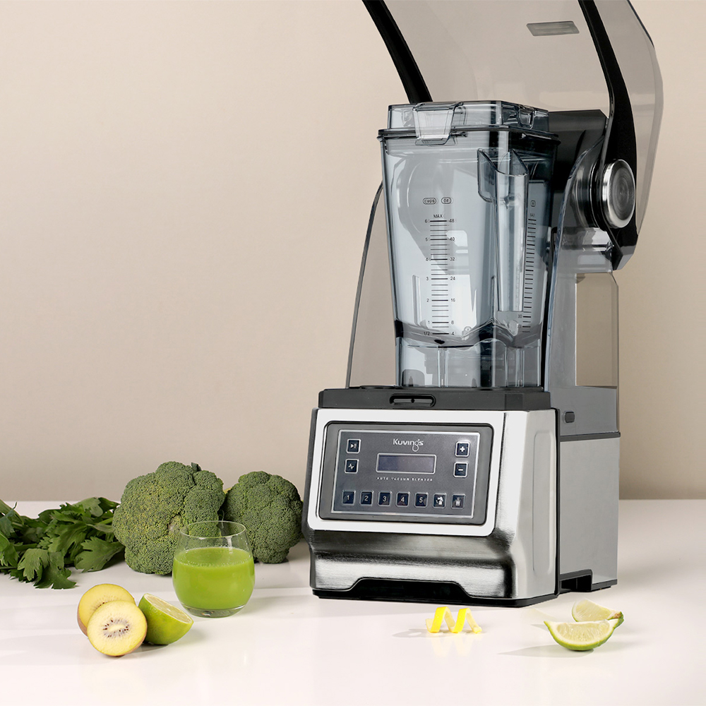 Máy xay sinh tố tự động hút và xả chân không dành cho kinh doanh hiệu Kuvings hoạt động liên tục 3 phút một lần xay và xay được 200+ ly mỗi ngày, gồm 1 cối xay với công suất cực mạnh 3.5 HP – 32,000RMP, 35 công thức tối ưu hóa cho menu quán cà phê, sinh tố được tích hợp sẵn cùng với 5 chế độ nhớ, dao xay cao cấp chuyên dụng cho kinh doanh không sinh nhiệt với công nghệ xay 3 chiều trong môi trường chân không cho nước sinh tố mịn hơn, màu sắc tươi hơn, chậm tách nước, ít bọt và giữ được nhiều Vitamin, Enzym trong rau củ quả. Bảng điểu khiển một chạm cảm ứng để điều chỉnh 5 chế độ xay tự động, chế độ xay nhanh, chế độ xay thủ công và nhồi, tự động đóng mở nắp, nắp chống ồn, chế độ tự động ngắt điện an toàn khi quá tải hay quá nóng và khóa an toàn khi gắn cối xay không đúng cách, có chế độ tiết kiệm điện tự động, thuận tiện sử dụng kinh doanh nhà hàng, quán bar, quán cafe, khách sạn, màu Inox.
