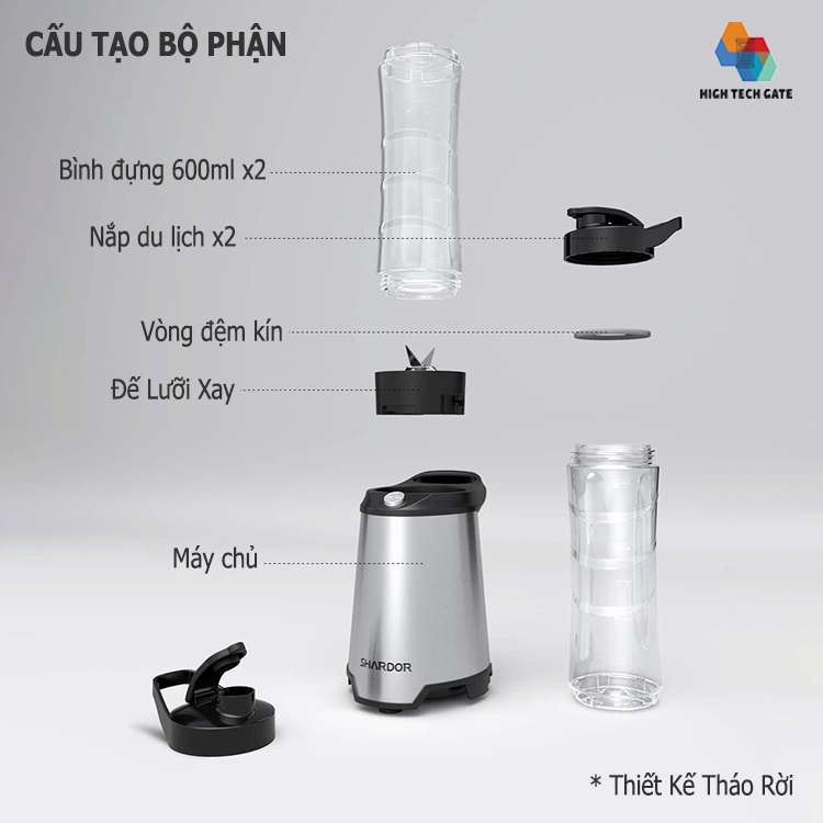 Tích hợp 2 bình đựng du lịch dung tích lớn 600ml Máy xay sinh tố Shardor PB615B với 2 bình đựng Tritan - không chứa BPA và 2 Nắp Du lịch miễn phí, tuyệt vời cho chuyến du lịch, công tác, thể thao ngoài trời, phòng tập gym hay văn phòng.
