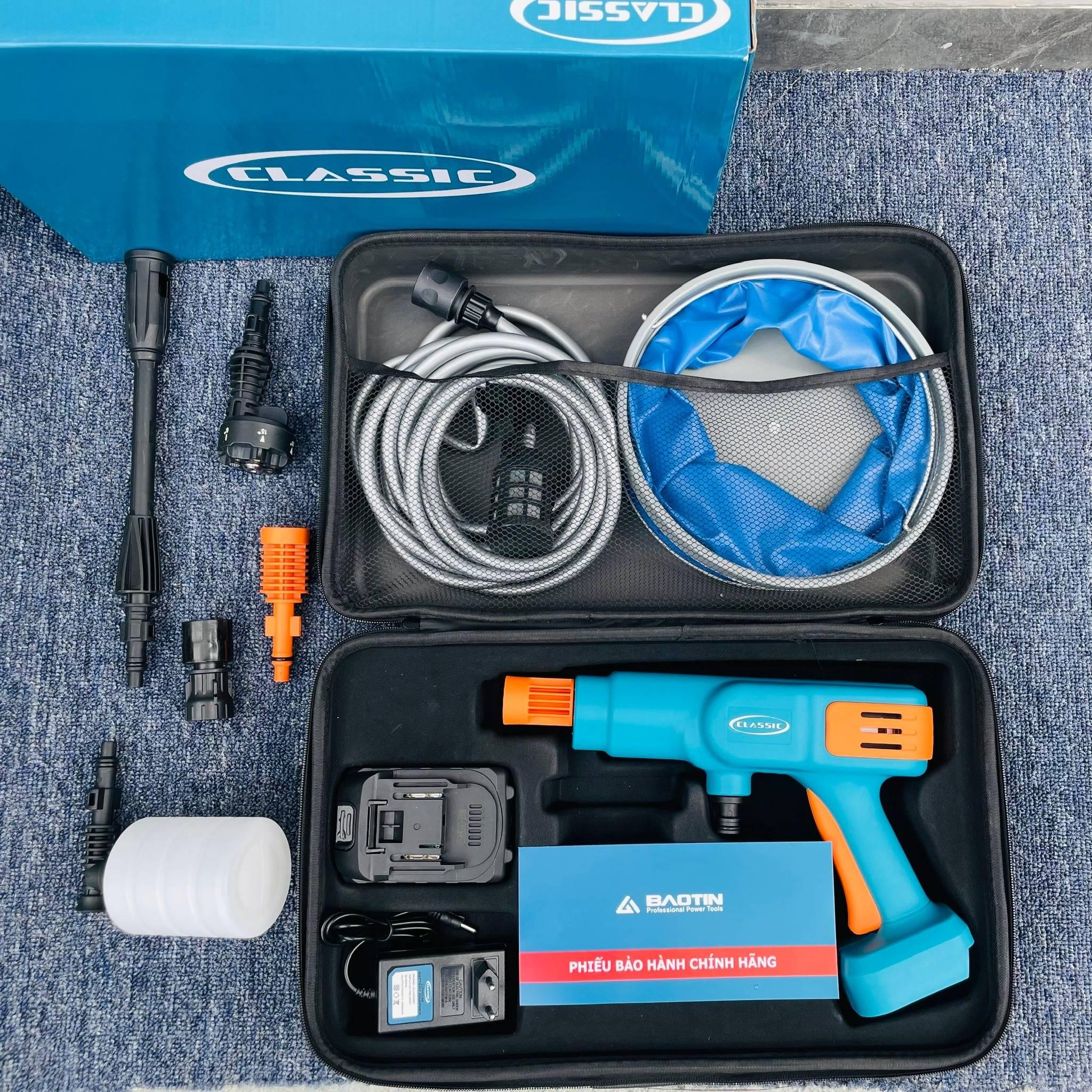 -Phụ kiện: 01pin + sạc; Xô nước, 3 đầu xịt, bình xà bông….đầy đủbộ phụ kiệ