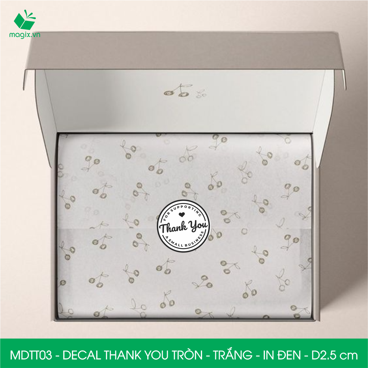 Decal - sticker Thank You là loại nhãn dán có nội dung "Cám ơn" được thiết kế theo hình tròn. Decal Thank You tròn thường được sử dụng để trang trí đóng gói thời trang, quà tặng… để thể hiện sự biết ơn, trân trọng tới người được nhận.   Sticker thank you tròn có nhiều đặc điểm nổi bật như: Kiểu dáng: Có nhiều thiết kế với nhiều hình ảnh, họa tiết hoặc chữ viết khác nhau, từ đơn giản đến cầu kỳ. Dễ dàng lựa chọn mẫu theo mục đích sử dụng. Kích thước: Đường kính: 2.5cm Chất liệu: Decal Thank You được làm từ giấy decal 3 lớp trên bề mặt được phủ thêm 1 lớp màng mờ, tăng khả năng chống thấm nước giúp decal bền hơn. Ngoài ra khi cán thêm lớp màng mờ sẽ giúp món quà trở lên sang trọng và bắt mắt hơn. Công dụng: Dán trên các gói hàng, quà tặng để thể hiện sự biết ơn đối với người nhận Dán trên các sản phẩm, dịch vụ để thể hiện sự trân trọng đối với khách hàng Dán trên các tài liệu, văn bản để thể hiện sự cảm ơn đối với người nhận Dán trên các vật dụng trang trí để tạo điểm nhấn   QUY CÁCH KỸ THUẬT Mã sản phẩm: MDTT Kiểu dáng: Hình tròn Đường kính: 2.5cm Đóng gói: 50 tem/ pack Kích thước đóng gói: 3x15cm Chất liệu: Decal 3 lớp - cán màng Màu sắc: Nhiều màu   LƯU Ý:  Bảo quản sản phẩm nơi khô ráo, sạch sẽ tránh tiếp xúc nơi có ánh sáng mặt trời và khu vực độ ẩm cao.