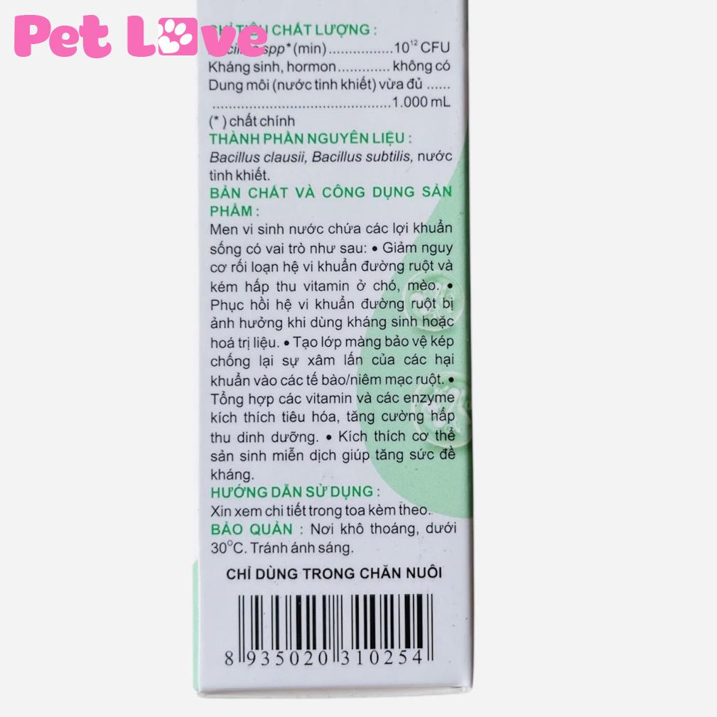 * Men vi sinh dạng nước, chứa đến 5 tỷ lợi khuẩn sống.* Hỗ trợ tiêu hóa cho chó mèo.* Sản phẩm chính hãng của công ty Vemedim.THÀNH PHẦN NGUYÊN LIỆU:Bacillus clausii, Bacillus subtilis, nước tinh ...