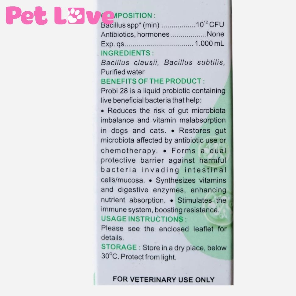 Vemedim Probi 28 Men Vi Sinh với 5 tỷ Lợi Khuẩn Vượt Trội, Bảo Vệ Đường Ruột cho Chó Mèo THÀNH PHẦN: Bacillus spp* (min) 10mũ12 CFU Kháng sinh, hormon không có Dung môi (nước tinh