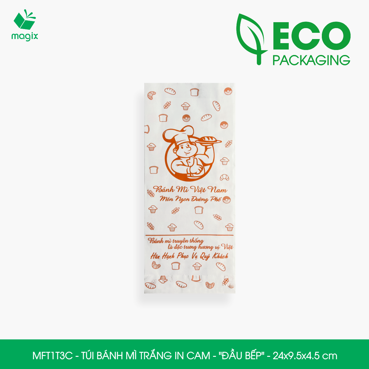 ĐẶC ĐIỂM SẢN PHẨM Chất liệu: Túi bánh mì in thường được làm từ giấy kraft nhật định lượng 50gsm thấm dầu có giấy chứng nhận FDA đảm bảo vệ sinh an toàn thực phầm Thiết kế: Miệng túi thiết kế chia thành 2 lớp dễ dàng thao tác bỏ bánh mì vào túi, đơn giản và tiện dụng    CÔNG DỤNG Tiện lợi: Bảo vệ bánh mì khỏi bụi bẩn, môi trường ô nhiễm, tác động từ bên ngoài và tránh làm dơ tay khi sử dụng Quảng cáo thương hiệu: Túi bánh mì in được sử dụng như một phương tiện quảng cáo nhỏ gọn và hiệu quả, với thiết kế in ấn logo, thông tin về sản phẩm và các thông điệp quảng cáo khác Bảo vệ môi trường: Túi bánh mì được làm từ chất liệu giấy kraft nguyên sinh, giúp giảm thiểu lượng rác thải nhựa và bảo vệ môi trường Tiết kiệm chi phí: Túi giấy bánh mì có giá thành thấp hơn so với các loại bao bì khác như hộp giấy, hộp nhựa đựng bánh mì   TIÊU CHUẨN KỸ THUẬT Chất liệu: Giấy Kraft chuyên dùng cho thực phẩm đạt tiêu chuẩn FDA  Định lượng: 50gsm Mã hàng - Kiểu in - Kích thước  • MFT1N5NN - Túi bánh mì nâu in nâu - "Giỏ bánh mì" - 24x9.5x4.5 cm  • MFT1T5N - Túi bánh mì trắng in nâu - "Giỏ bánh mì" - 24x9.5x4.5 cm  • MFT1N4X - Túi bánh mì nâu in xanh lá - "Best street food" - 24x9.5x4.5 cm  • MFT1T4X - Túi bánh mì trắng in xanh lá - "Best street food" - 24x9.5x4.5 cm  • MFT1N4NN - Túi bánh mì nâu in nâu đỏ - "Best street food" - 24x9.5x4.5 cm  • MFT1T4N - Túi bánh mì trắng in nâu - "Best street food" - 24x9.5x4.5 cm  • MFT1T3C - Túi bánh mì trắng in cam - "Đầu bếp" - 24x9.5x4.5 cm  • MFT1N3NN - Túi bánh mì nâu in nâu đỏ - "Đầu bếp" - 24x9.5x4.5 cm  • MFT1T3NN - Túi bánh mì trắng in nâu đỏ - "Đầu bếp" - 24x9.5x4.5 cm  • MFT1N2NN - Túi bánh mì nâu in nâu đỏ - "Cối xay gió" - 24x9.5x4.5 cm  • MFT1T2N - Túi bánh mì trắng in nâu - "Cối xay gió" - 24x9.5x4.5 cm  • MFT1N1NN - Túi bánh mì nâu in nâu đỏ - "Xe bánh mì" - 24x9.5x4.5 cm  • MFT1T1N - Túi bánh mì trắng in nâu - "Xe bánh mì" - 24x9.5x4.5 cm   LƯU Ý Bảo quản sản phẩm nơi khô ráo, sạch sẽ tránh tiếp xúc trực tiếp với ánh nắng mặt trời và nhiệt độ cao.