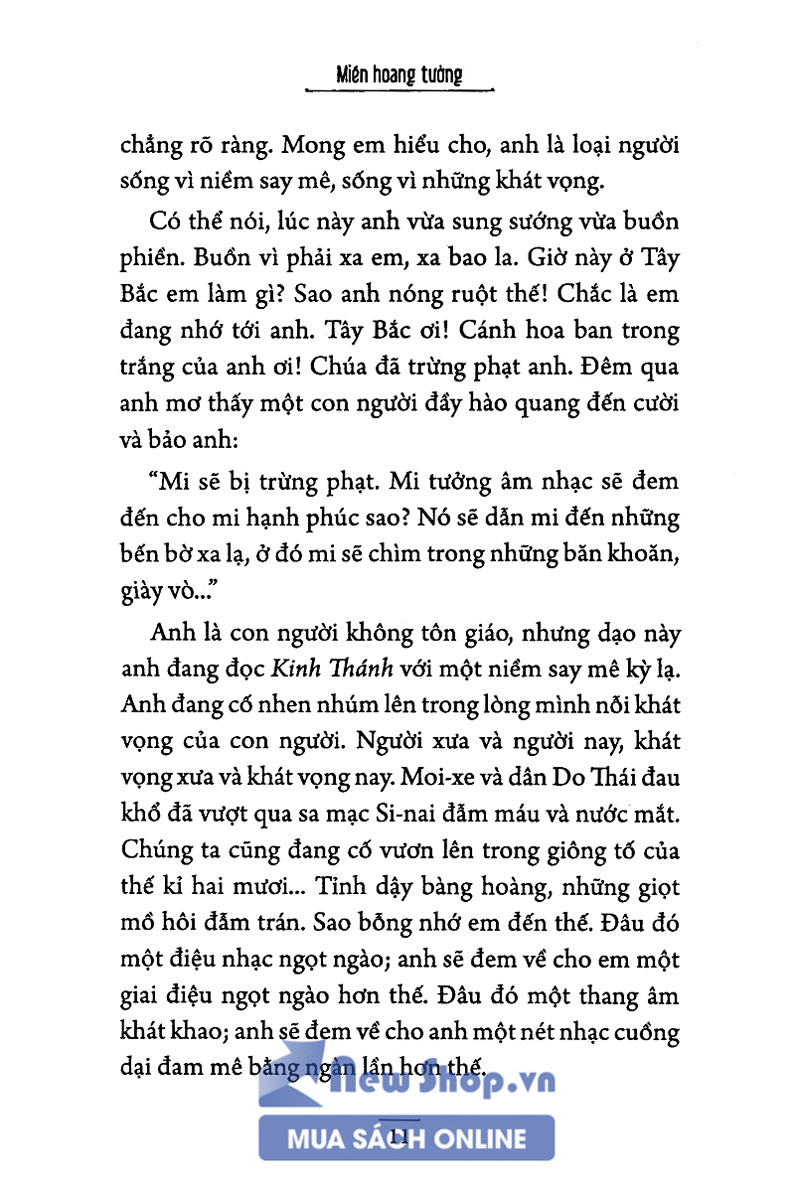 Miền Hoang Tưởng là cuốn tiểu thuyết gồm một chuỗi bức thư của nhân vật Tư gửi cho người yêu tên Ngà, kể về cuộc sống đầy khó khăn thử thách của anh sau khi từ Tây Bắc xuống Hà Nội để theo đuổi sự nghiệp âm nhạc. Song song với đó là những đối thoại của Tư với Chúa về những gì anh nhìn thấy từ muôn phận người trong xã hội.