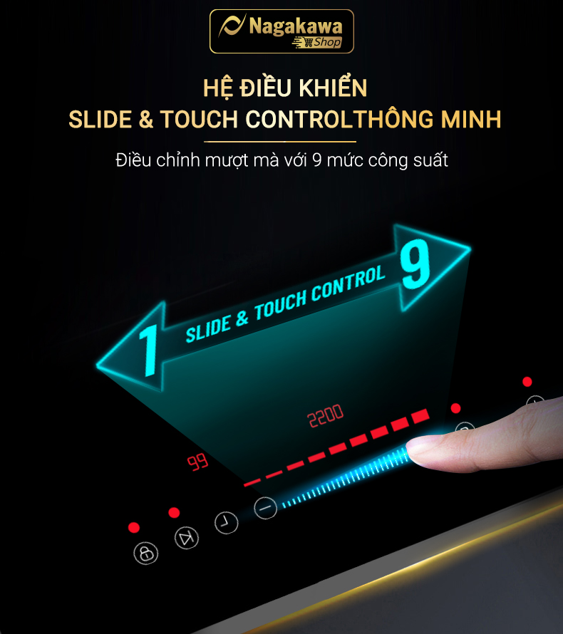 Với bếp đôi điện từ hồng ngoại Nagakawa NAG1252M, bạn có thể lựa chọn cách điều chỉnh tăng giảm công suất bằng cách có thể vuốt di chuyển trái, phải hoặc trực tiếp ấn phím điều chỉnh 9 mức công suất.