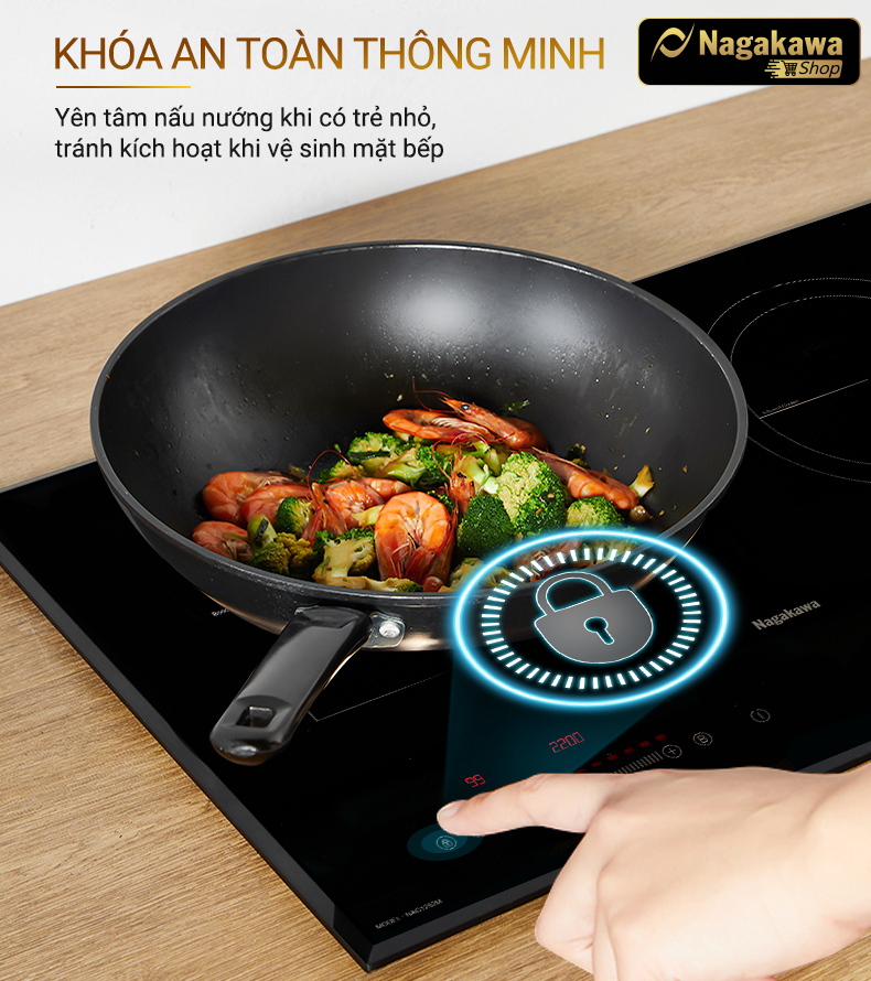 Bếp đôi điện từ hồng ngoại Nagakawa NAG1252M được trang bị khóa an toàn, giúp bạn yên tâm nấu nướng khi nhà có trẻ nhỏ. Bạn cũng có thể lựa chọn sử dụng phím, tránh tình trạng kích hoạt các nút không cần thiết khi cần vệ sinh mặt bếp.