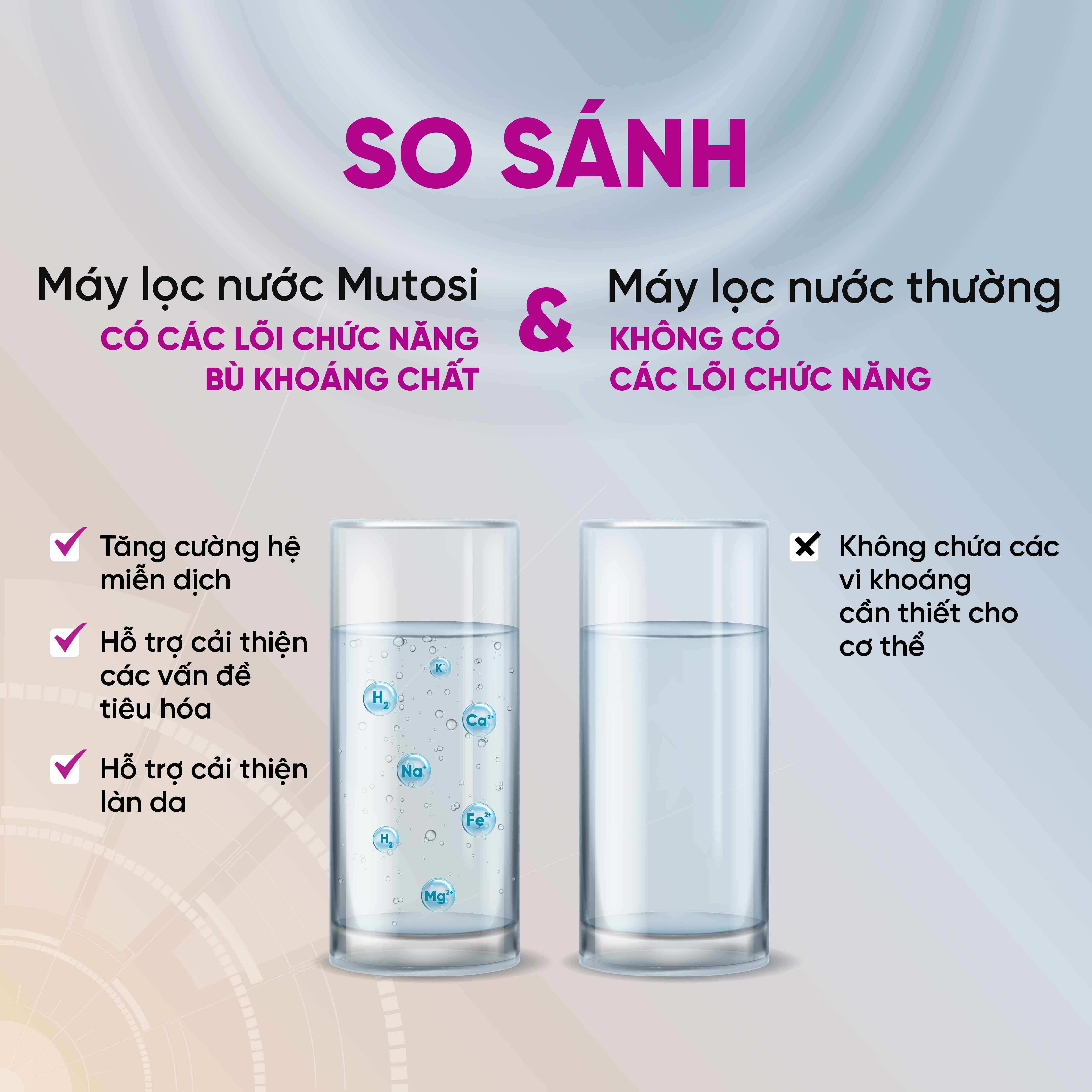 - Tiện lợi và tiết kiệm chi phí sinh hoạt: thay vì sử dụng nước đóng chai hay nước đun sôi lại, nguồn nước sạch được lọc, làm nóng trực tiếp (nếu có) từ máy sẽ an toàn, nhanh chóng và tiện lợi hơn. Nước sau lọc có thể uống trực tiếp tại vòi, không cần đun sôi. Máy lọc nước RO nóng nguội lạnh Mutosi MP-M1011 với hệ thống 10 lõi lọc, trong đó màng lọc RO 100 GPD sản xuất tại Hàn Quốc giúp lọc nước sạch hiệu quả, công suất đến 20 lít/giờ, 2 vòi 3 chế độ nước,... đây chắc chắn là một thiết bị gia dụng tốt cho sức khoẻ mà gia đình bạn không nên bỏ qua.