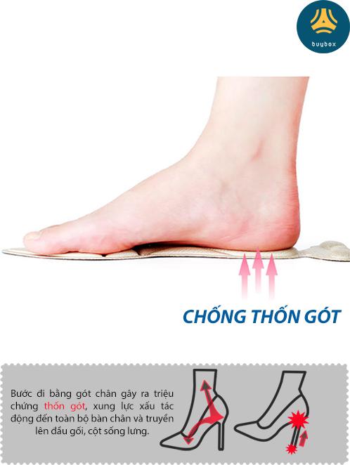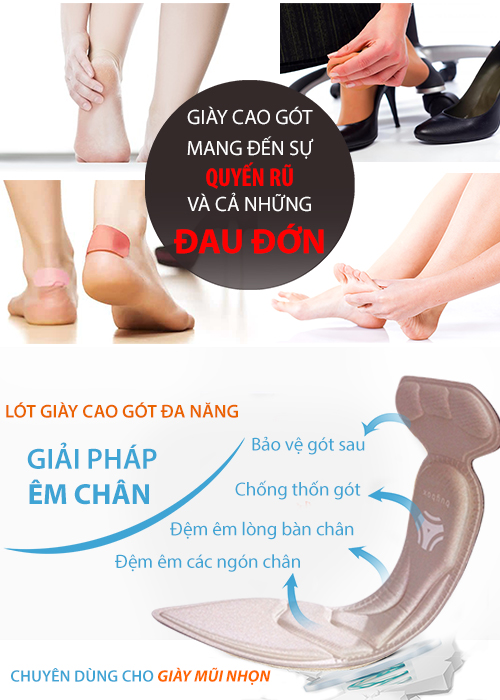 - Công dụng tuyệt vời: chống trầy gót sau bàn chân khi mang giày cao gót, giày búp bê; chống thốn gót chân; giảm đau gang bàn chân; mang lại cảm giác êm chân tuyệt đối.