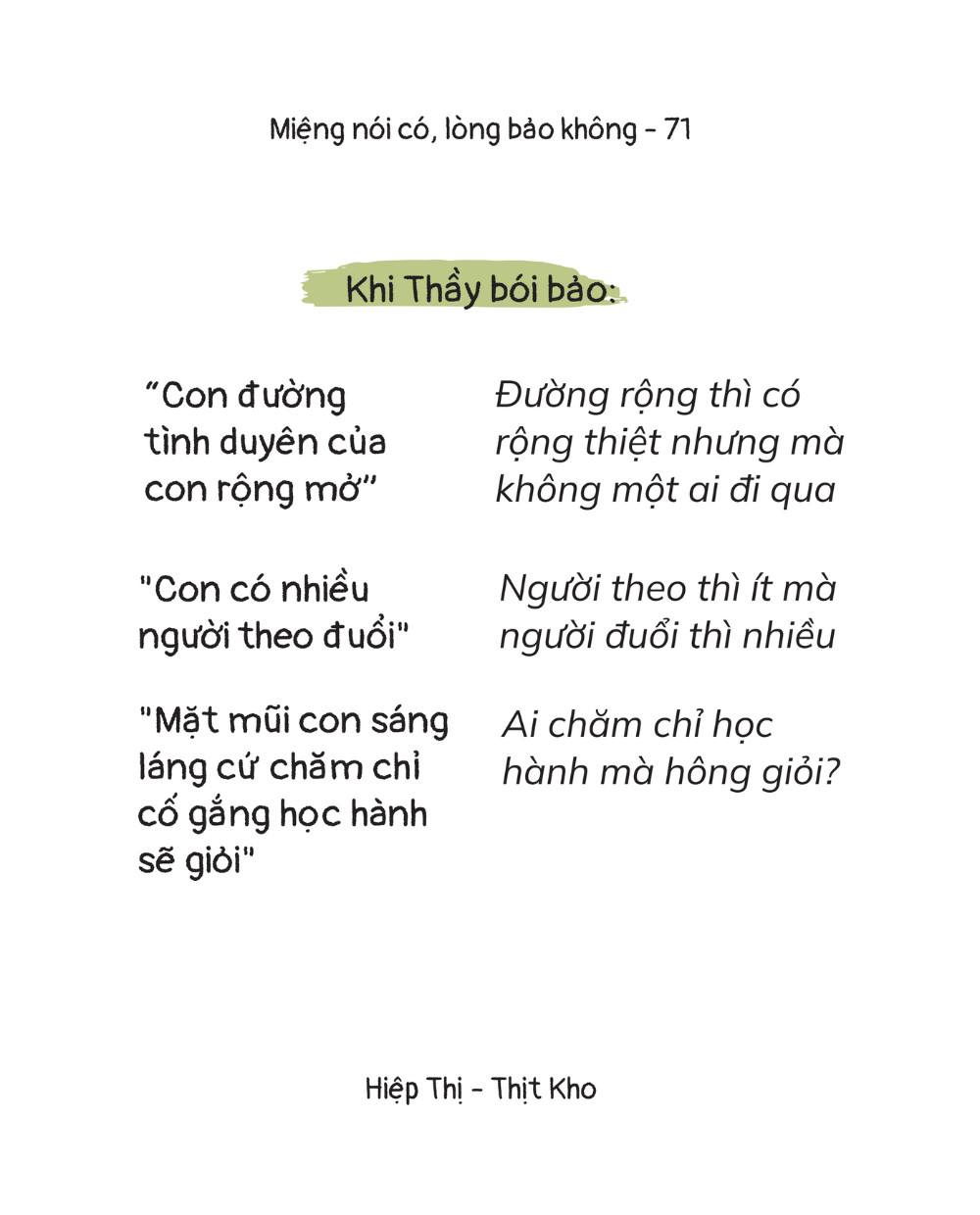 “Miệng nói có lòng bảo không” là cuốn sách nhỏ xinh tổng hợp 7749 câu nói, tình huống đời thường mà bất cứ ai cũng đều gặp phải; nhưng được giải nghĩa dưới góc nhìn dí dỏm và “không lường trước được”; khiến bạn đọc không khỏi bất ngờ, ngơ ngác và “bật cười té ghế”. Lật giở từng trang sách, bạn sẽ được “gặp gỡ" chính mình cùng “những nhân cách khác" của bản thân, mà nhân cách nào cũng… đáng yêu vô cùng.