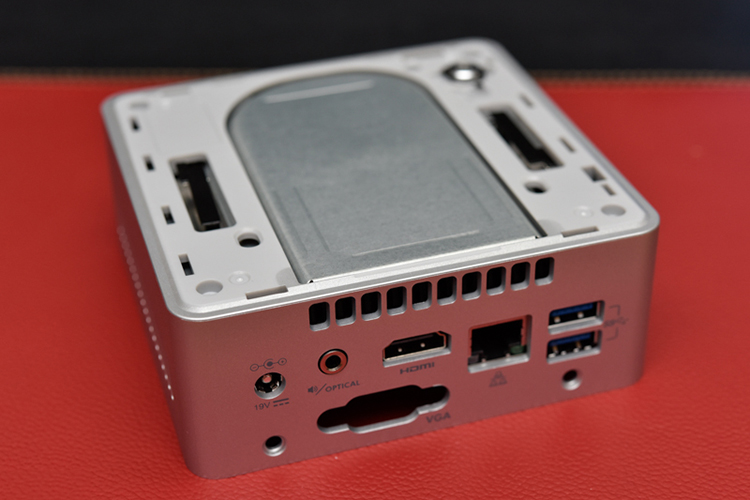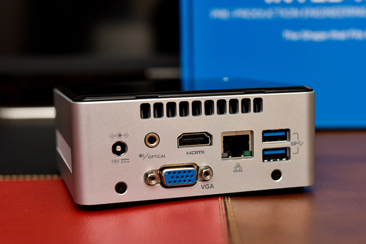 Mặt trước của sản phẩm gồm 2 cổng USB 3.0 và jack âm thanh 3,5 mm 2 trong 1. Với cổng màu vàng, bạn có thể cắm sạc thiết bị di động với đầu ra 1,5 A. Mặt sau có thêm 2 cổng USB 3.0 nữa, cổng LAN, HDMI 1.4a, VGA và jack âm thanh quang học TOSLINK.Ngoài ra bên hông còn có các khe lưu thông luồng khí và một khe cắm thẻ nhớ SD.