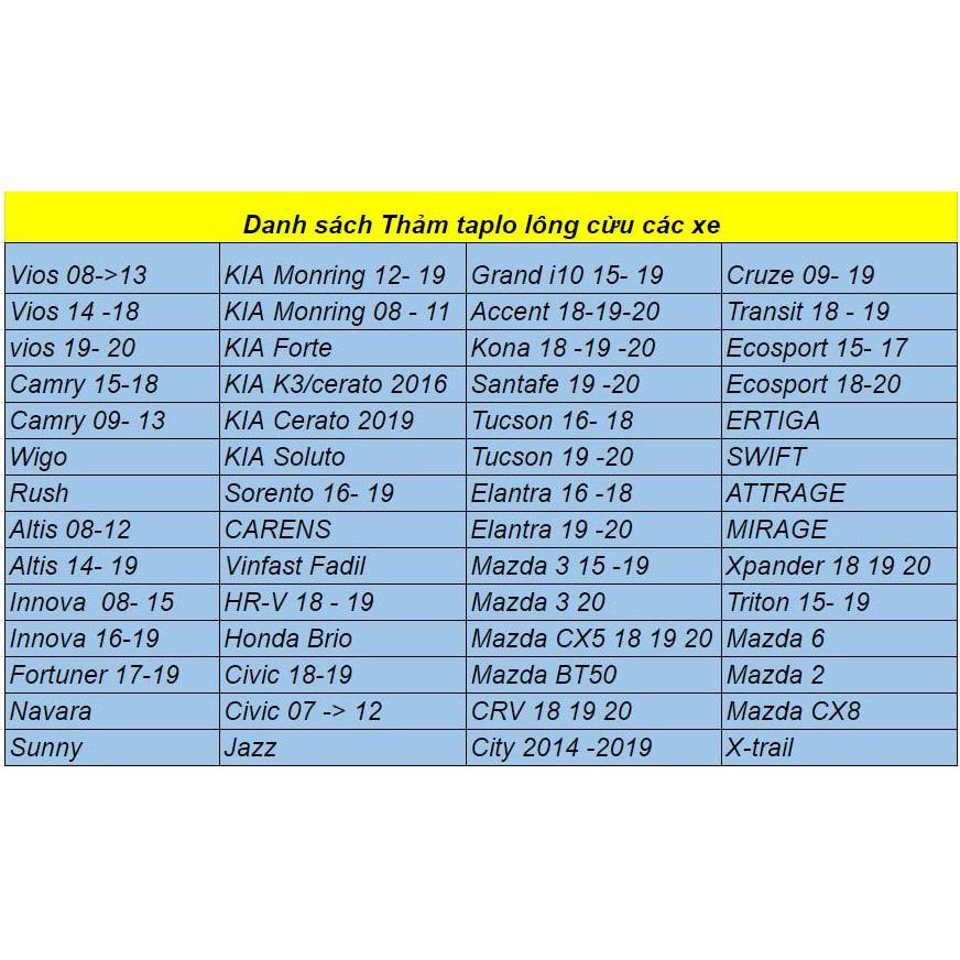 Thảm được làm từ chất liệu vải nhung mềm,mịn có độ bền cao có thể giặt sạch khi bị bám bẩn.Sản phẩm được thiết kế riêng cho từng hãng xe, đời xe đảm bảo luôn vùa khít bề mặt taplo xe, đường chỉ may chắc,tinh tế ,cùng logo được in nổi đảm bảo độ bền và nét thời trang của bề mặt thảm taplo.