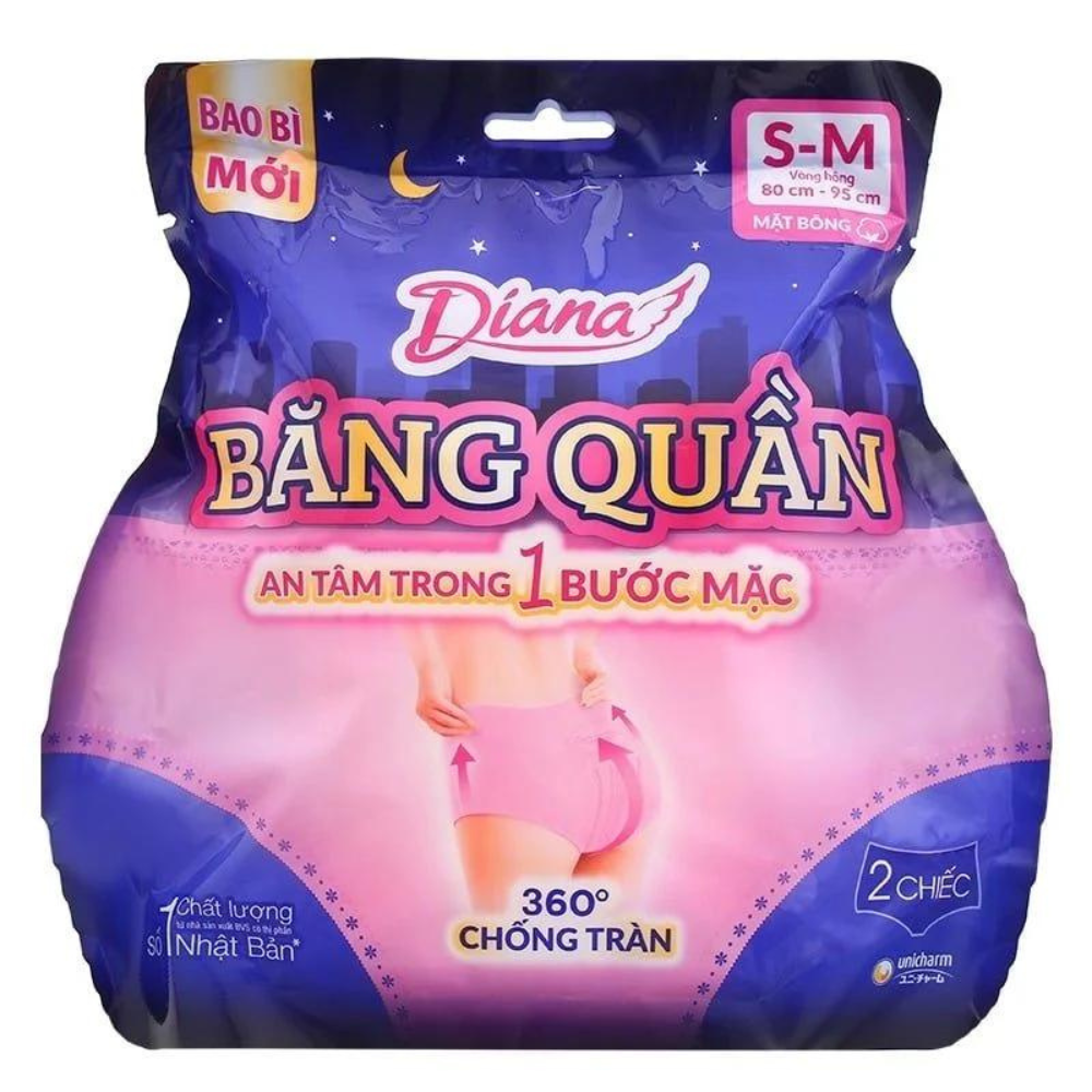 Mua tại TiktokBăng vệ sinh quần Diana chống tràn 360 size S/M, Băng vệ sinh Diana ban đêm dạng quần gói 5 miếng. Băng vệ sinh quần Diana chống tràn 360 size S/M với đột phá “2 trong 1”: Sử dụng Thiết kế quần lót nhỏ gọn vừa vặn với cơ thể kết hợp cùng Cấu trúc băng ban đêm bảo vệ an toàn khiến các nàng mặc thoải mái trong mọi tư thế ngủ, xóa tan nỗi lo tràn băng. Thông tin sản phẩm Băng vệ sinh Diana ban đêm dạng quần gói 5 miếng
