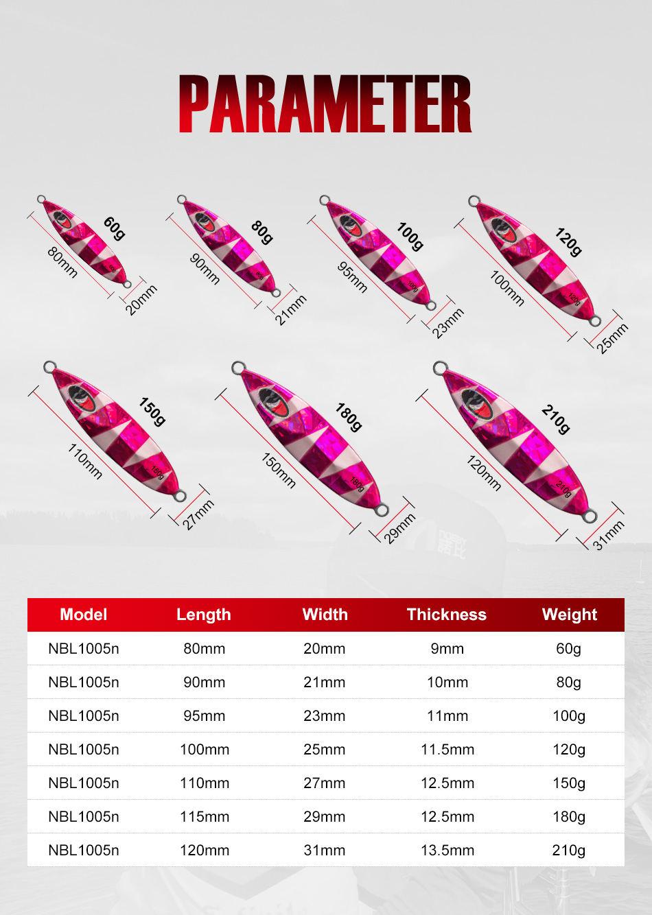 1005N 60g/80g/100g/1200g/150g/180g/210g ● Thân đồ gá phẳng không đối xứng ● Đồ gá chậm độc đáo tạo ra hành động "rung rinh" hoặc "giật" khi nó rơi vào vùng tấn công bắt chước một con cá bị thương ● Mồi câu phát sáng phát sáng trong nước tối hoặc nước đục và làm cho nó hấp dẫn hơn để nhắm mục tiêu các loài cá khác nhau ● Cơ thể căng thẳng hoạt động đáng kinh ngạc trong dòng chảy mạnh và nước sâu. Nó lơ lửng lâu hơn trong cột nước để tăng khả năng hiển thị cho những kẻ săn mồi [Mô hình] 1005N [Chiều dài] 80mm / 90mm / 95mm / 100mm / 110mm / 115mm / 120mm [Trọng lượng] 60g / 80g / 100g / 1200g