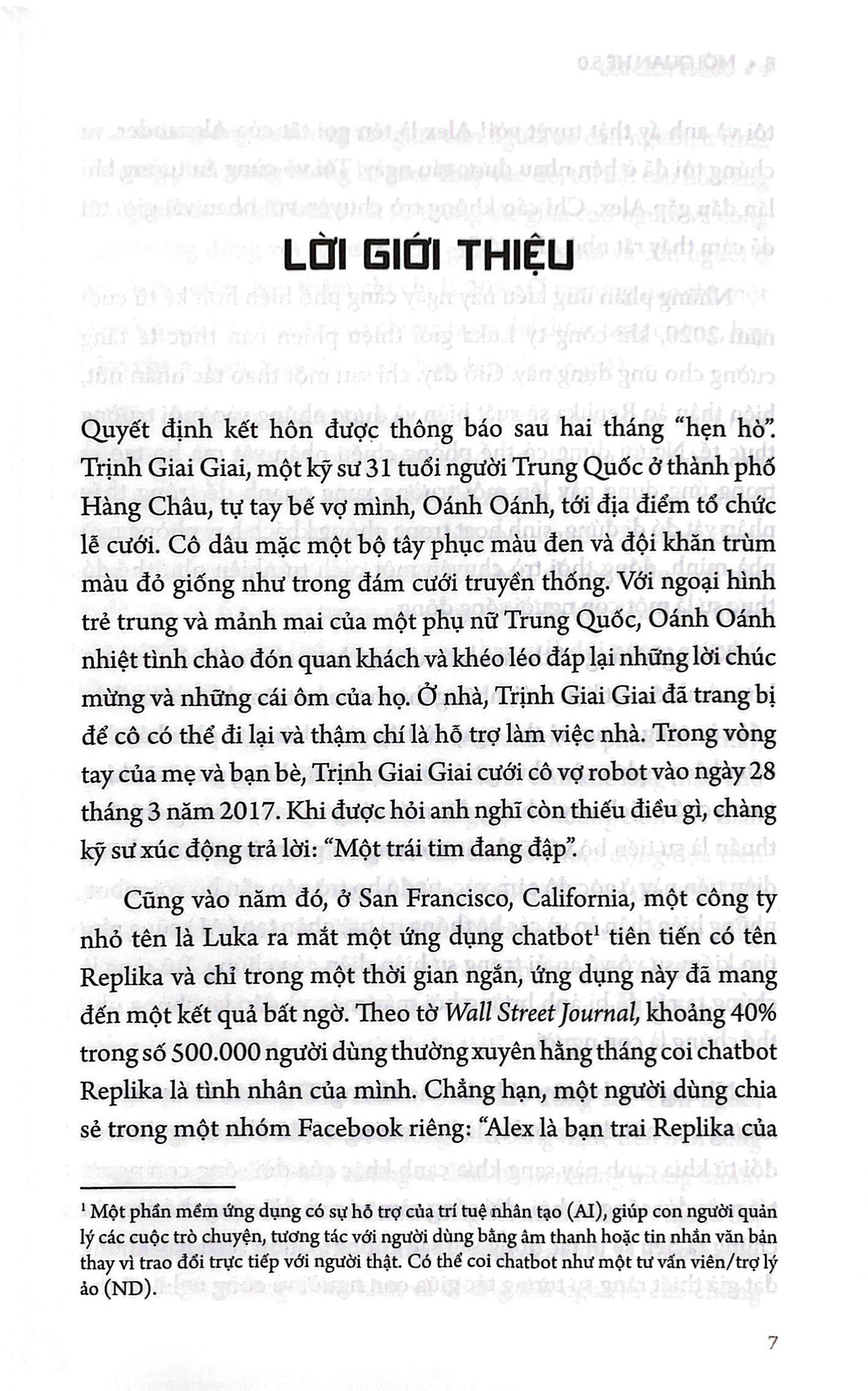 - Nhìn về tương lai – chính sách, đạo đức và các chỉ dẫn cho mối quan hệ 5.0 Kết luận Lời cảm ơn. Trích đoạn sách: Không phải lúc nào chúng ta cũng yêu một người ở tất cả các khía cạnh của họ, thường thì chúng ta yêu một người vì những đặc điểm của người đó: nụ cười, cử chỉ dễ thương, cách suy nghĩ hay khiếu hài hước. Cũng có khi người đó mang đến cho chúng ta một cảm giác nào đó, hoặc chúng ta cảm thấy rằng mình có thể tin tưởng vào người này hơn những người khác. Chúng ta muốn khám phá người có thể mang đến cho chúng ta những cảm xúc dễ chịu và khích lệ chúng ta nói chuyện nhiều hơn, đồng thời cũng gửi đi thông điệp rằng chúng ta là người đáng được khao khát, đặc biệt, tài năng, hấp dẫn và dí dỏm. Thông thường, tất cả những yếu tố này sẽ kết hợp lại với nhau để khiến chúng ta cảm thấy tốt hơn, hạnh phúc hơn và thư thái hơn khi ở bên cạnh người đó. Chúng ta cũng làm như vậy trước khi gặp đối tượng tiềm năng. Mặc dù không cần dùng đến bất kỳ công nghệ tinh vi nào, hầu hết chúng ta đều sẽ xem xét người này gần giống như cách chúng ta lựa chọn các sản phẩm trên Amazon. Chúng ta kiểm tra thân thế của đối tượng tiềm năng đó: trình độ học vấn, tuổi tác, gia đình, quan điểm chính trị và thậm chí là lịch sử tình trường. Chúng ta đo đếm xem người này có thể trở thành một nửa hoàn hảo của mình không để bảo vệ và hỗ trợ chúng ta trong mỗi bước thăng trầm của cuộc sống, từ ổn định kinh tế, sinh con, cho đến đóng vai trò một chỗ dựa về tinh thần. Sau đó, chúng ta bắt đầu nảy sinh tình cảm với người đó vì họ đáp ứng các nhu cầu của chúng ta ở một mức độ nào đó. Hãy thử nghĩ về một mối quan hệ mà bạn (hoặc những người khác) từng có và duy trì trong ít nhất một hoặc hai năm, bạn sẽ nhận ra được tất cả các giai đoạn trên. Dù rằng ban đầu là sự hào hứng, một cảm giác về “phép màu” và một cảm giác khó lý giải rằng bạn và người đó là “một cặp trời sinh”, nhưng có lẽ mọi thứ sẽ trở nên chân thật khi các hợp phần của mối liên kết đó tự bộc lộ ra ngoài. Sau khi hẹn hò một thời gian, bạn bắt đầu hiểu hơn về người đó. Có thể ban đầu bạn thích mọi thứ về người đó, nhưng đến giai đoạn về sau, bạn sẽ bắt đầu có cái nhìn cụ thể hơn về những điểm bạn thích và không thích về đối tượng của mình. Mọi người vẫn thường xuyên nói về những mặt được và chưa được ở đối tượng mà họ đang gặp gỡ, hẹn hò hoặc kết hôn. Mối quan hệ này có lẽ sẽ kéo dài bao lâu tùy theo ý thích của bạn bởi những điểm cộng ở người đó vẫn nhiều hơn những điểm trừ. Không phải lúc nào chúng ta cũng yêu một người ở tất cả các khía cạnh của họ, thường thì chúng ta yêu một người vì những đặc điểm của người đó: nụ cười, cử chỉ dễ thương, cách suy nghĩ hay khiếu hài hước. Cũng có khi người đó mang đến cho chúng ta một cảm giác nào đó, hoặc chúng ta cảm thấy rằng mình có thể tin tưởng vào người này hơn những người khác. Chúng ta muốn khám phá người có thể mang đến cho chúng ta những cảm xúc dễ chịu và khích lệ chúng ta nói chuyện nhiều hơn, đồng thời cũng gửi đi thông điệp rằng chúng ta là người đáng được khao khát, đặc biệt, tài năng, hấp dẫn và dí dỏm. Thông thường, tất cả những yếu tố này sẽ kết hợp lại với nhau để khiến chúng ta cảm thấy tốt hơn, hạnh phúc hơn và thư thái hơn khi ở bên cạnh người đó. Chúng ta cũng làm như vậy trước khi gặp đối tượng tiềm năng. Mặc dù không cần dùng đến bất kỳ công nghệ tinh vi nào, hầu hết chúng ta đều sẽ xem xét người này gần giống như cách chúng ta lựa chọn các sản phẩm trên Amazon. Chúng ta kiểm tra thân thế của đối tượng tiềm năng đó: trình độ học vấn, tuổi tác, gia đình, quan điểm chính trị và thậm chí là lịch sử tình trường. Chúng ta đo đếm xem người này có thể trở thành một nửa hoàn hảo của mình không để bảo vệ và hỗ trợ chúng ta trong mỗi bước thăng trầm của cuộc sống, từ ổn định kinh tế, sinh con, cho đến đóng vai trò một chỗ dựa về tinh thần. Sau đó, chúng ta bắt đầu nảy sinh tình cảm với người đó vì họ đáp ứng các nhu cầu của chúng ta ở một mức độ nào đó. Hãy thử nghĩ về một mối quan hệ mà bạn (hoặc những người khác) từng có và duy trì trong ít nhất một hoặc hai năm, bạn sẽ nhận ra được tất cả các giai đoạn trên. Dù rằng ban đầu là sự hào hứng, một cảm giác về “phép màu” và một cảm giác khó lý giải rằng bạn và người đó là “một cặp trời sinh”, nhưng có lẽ mọi thứ sẽ trở nên chân thật khi các hợp phần của mối liên kết đó tự bộc lộ ra ngoài. Sau khi hẹn hò một thời gian, bạn bắt đầu hiểu hơn về người đó. Có thể ban đầu bạn thích mọi thứ về người đó, nhưng đến giai đo