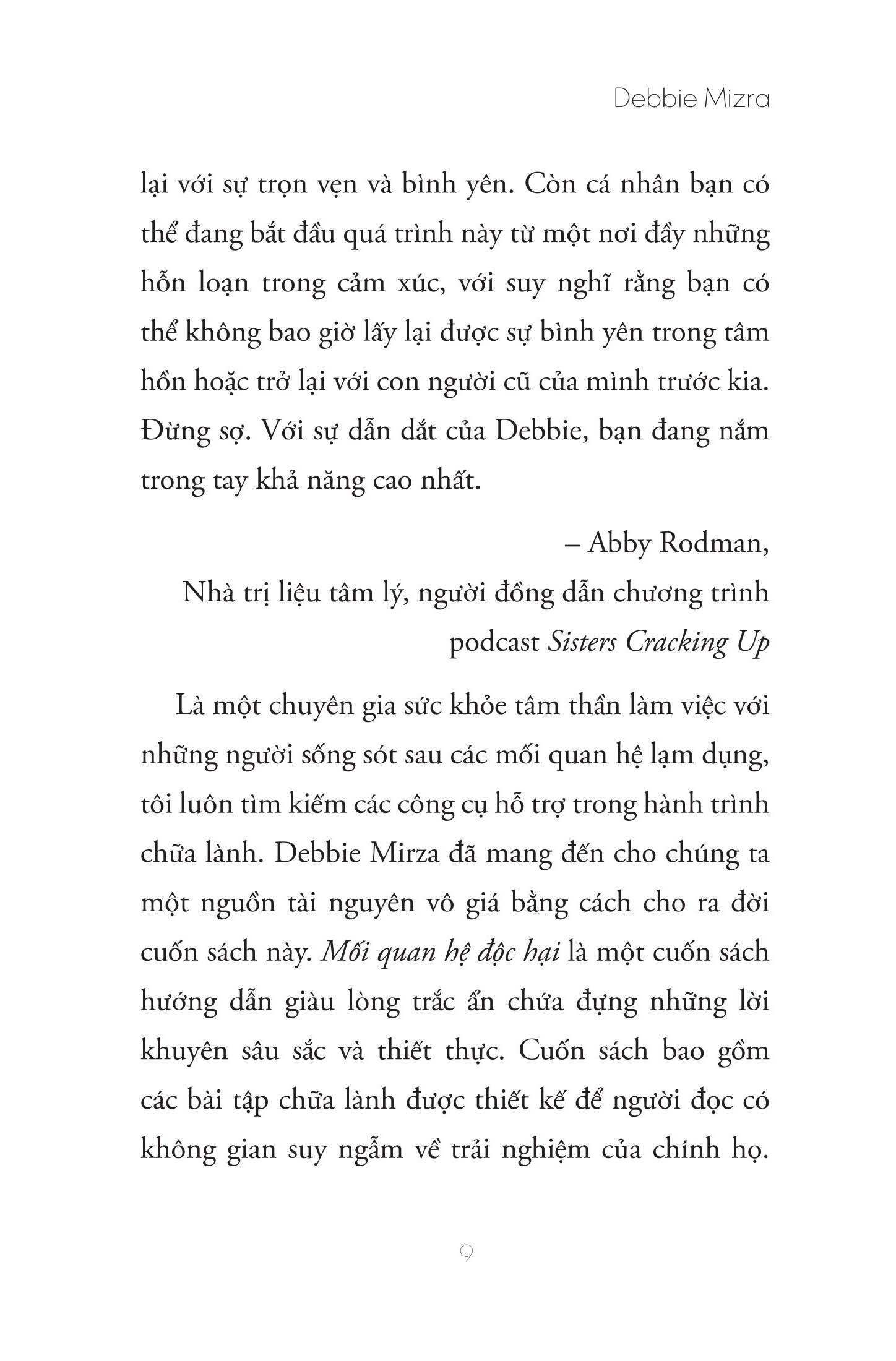 Mua tại TiktokMối Quan Hệ Độc Hại “Mối quan hệ độc hại” của tác giả Debbie Mirza là cuốn sách chia sẻ về hành trình chữa lành của những người bị lạm dụng bởi kẻ mắc chứng rối loạn ái kỷ. Cuốn sách sẽ tập trung vào các dấu hiệu để nhận biết một mối quan hệ độc hại đồng thời đưa ra những liệu pháp, hành trình phục hồi, cách tự chữa lành để bạn có thể tìm được tự do, sự bình yên trong cuộc sống của của m.ình. Cuốn sách sẽ giúp bạn xoa dịu những tổn thương, mất mát dù nhỏ hay lớn mà bạn gặp phải trong các mối quan hệ lạm dụng hoặc thao túng suốt những năm qua bởi cuốn sách sẽ cho bạn biết: