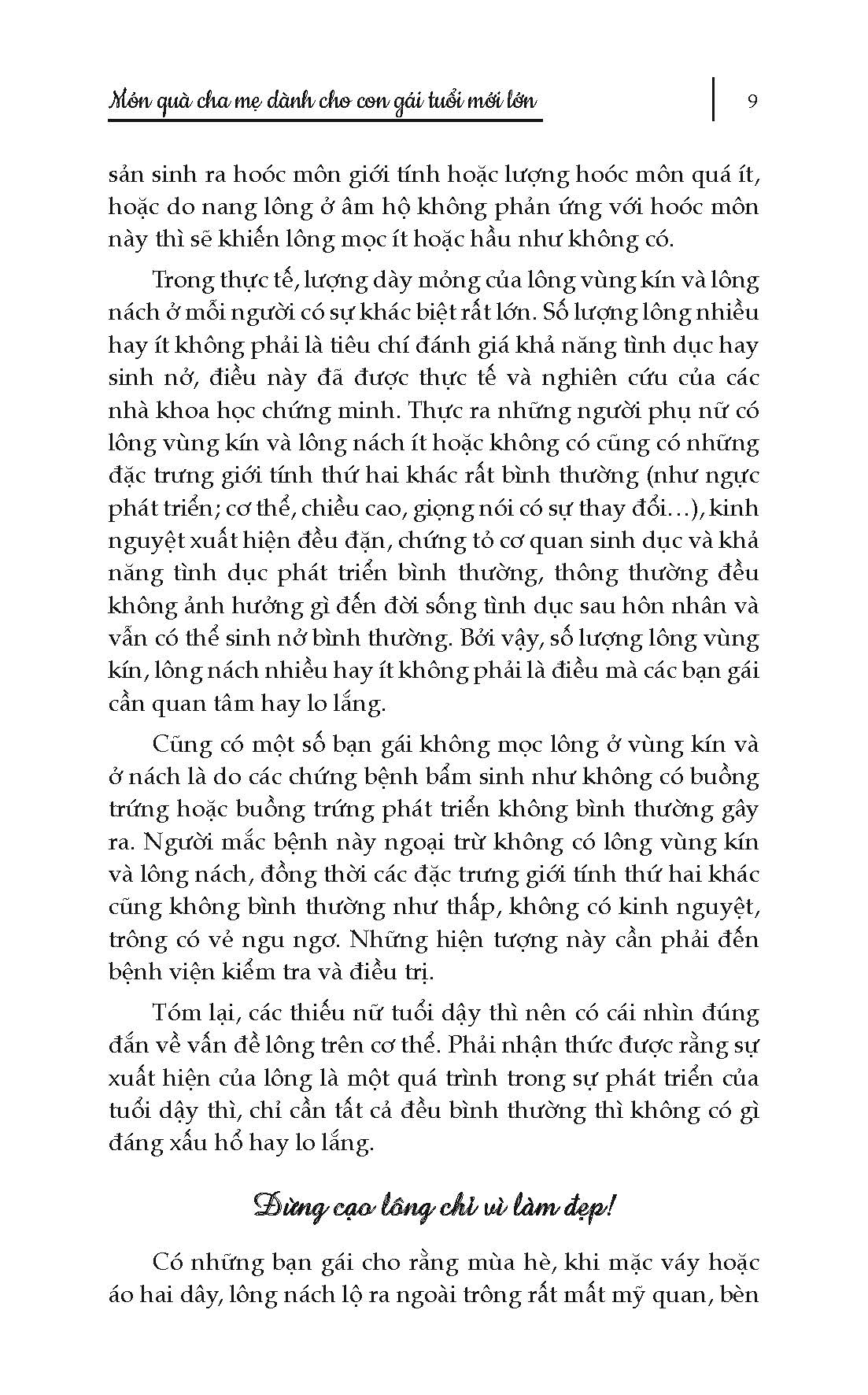 Mua tại TiktokMột cuốn cẩm nang hữu ích mà các bậc cha mẹ dành cho con gái tuổi mới lớn, cung cấp những kiến thức cơ bản, thiết thực nhất cùng những giải đáp các thắc mắc về tâm sinh lý, những vấn đề tế nhị mà các bạn nữ tuổi dậy thì thường gặp phải nhưng lại không dễ gì hỏi hay trao đổi trực tiếp với cha mẹ hay người khác, giúp các bạn vững vàng bước vào cuộc sống.