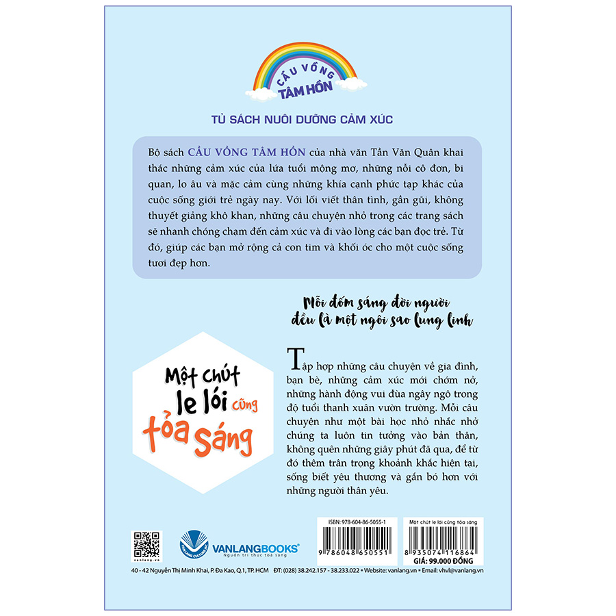 Bộ sách Cầu Vồng Tâm Hồn của nhà văn Tần Văn Quân khai thác những cảm xúc của lứa tuổi mộng mơ, những nỗi cô đơn, bi quan, lo âu và mặc cảm cùng những khía cạnh phức tạp khác của cuộc sống giới trẻ ngày nay. Với lối viết thân tình, gần gũi, không thuyết giảng khô khan, những câu chuyện nhỏ trong các trang sách sẽ nhanh chóng chạm đến cảm xúc và đi vào lòng các bạn đọc trẻ. Từ đó, giúp các bạn mở rộng cả con tim và khối óc cho một cuộc sống tươi đẹp hơn.