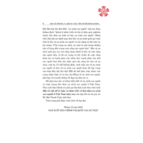 Mua tại TiktokĐể giúp bạn đọc có thêm hiểu biết về an ninh con người và thực trạng bảo đảm an ninh con người ở Việt Nam, Nhà xuất bản Chính trị quốc gia Sự thật xuất bản cuốn sách Một số vấn đề lý luận và thực tiễn về bảo đảm an ninh con người ở Việt Nam hiện nay của tập thể các tác giả, do TS. Bùi Thanh Tuấn chủ biên.