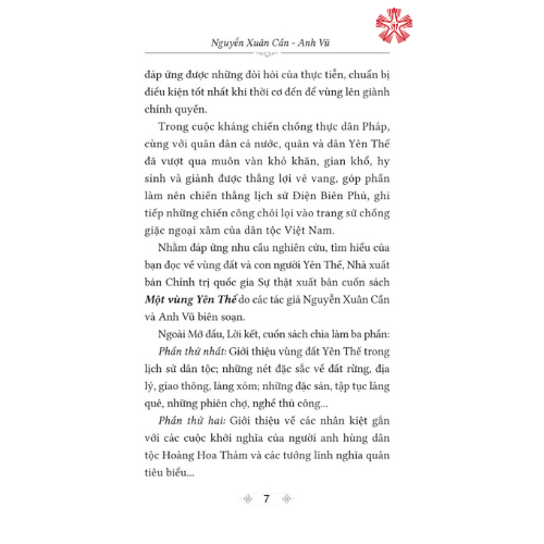 Nhằm đáp ứng nhu cầu nghiên cứu, tìm hiểu của bạn đọc về vùng đất và con người Yên Thế, Nhà xuất bản Chính trị quốc gia Sự thật xuất bản cuốn sách Một vùng Yên Thế do các tác giả Nguyễn Xuân Cần và Anh Vũ biên soạn. Ngoài Mở đầu, Lời kết, cuốn sách chia làm ba phần: Phần thứ nhất: Giới thiệu vùng đất Yên Thế trong lịch sử dân tộc; những nét đặc sắc về đất rừng, địa lý, giao thông, làng xóm; những đặc sản, tập tục làng quê, những phiên chợ, nghề thủ công... Phần thứ hai: Giới thiệu về các nhân kiệt gắn với các cuộc khởi nghĩa của người anh hùng dân tộc Hoàng Hoa Thám và các tướng lĩnh nghĩa quân tiêu biểu... Phần thứ ba: Giới thiệu các di tích lịch sử, văn hóa tiêu biểu ở địa phương.