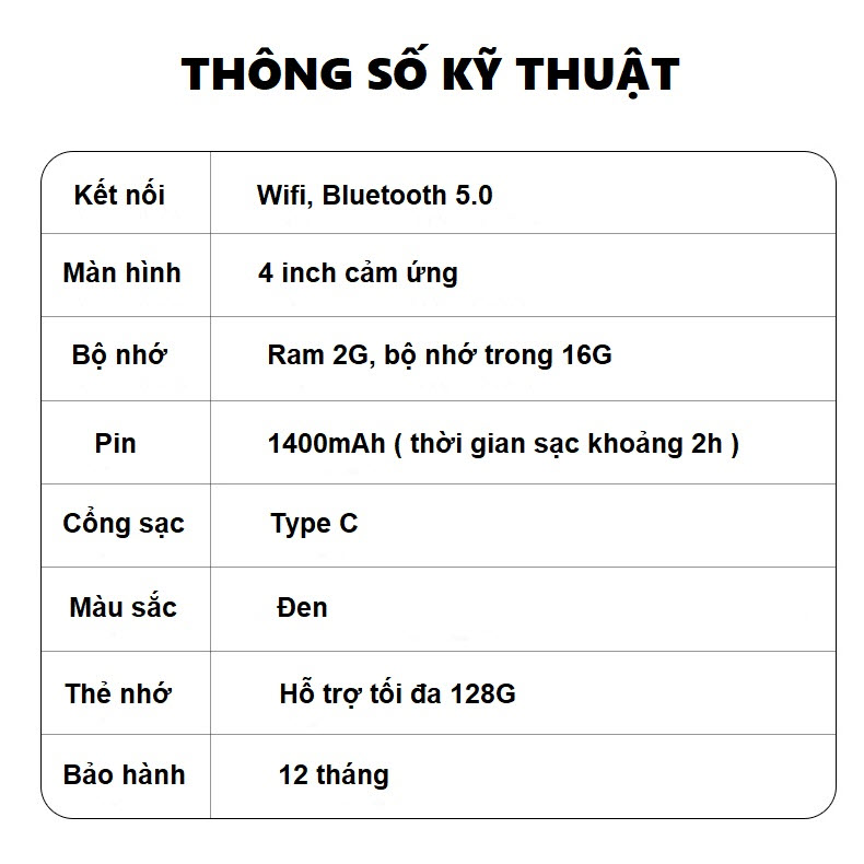 Màn hình: 1.8 inch TFT Độ phân giải màn hình: 126*160 Kích thước: 96*42*9.6mm Bộ nhớ: 8G Chức năng Bluetooth: Bluetooth 4.2. Hỗ trợ kết nối Bluetooth tai nghe và loa Bluetooth. Nhạc nền phát
