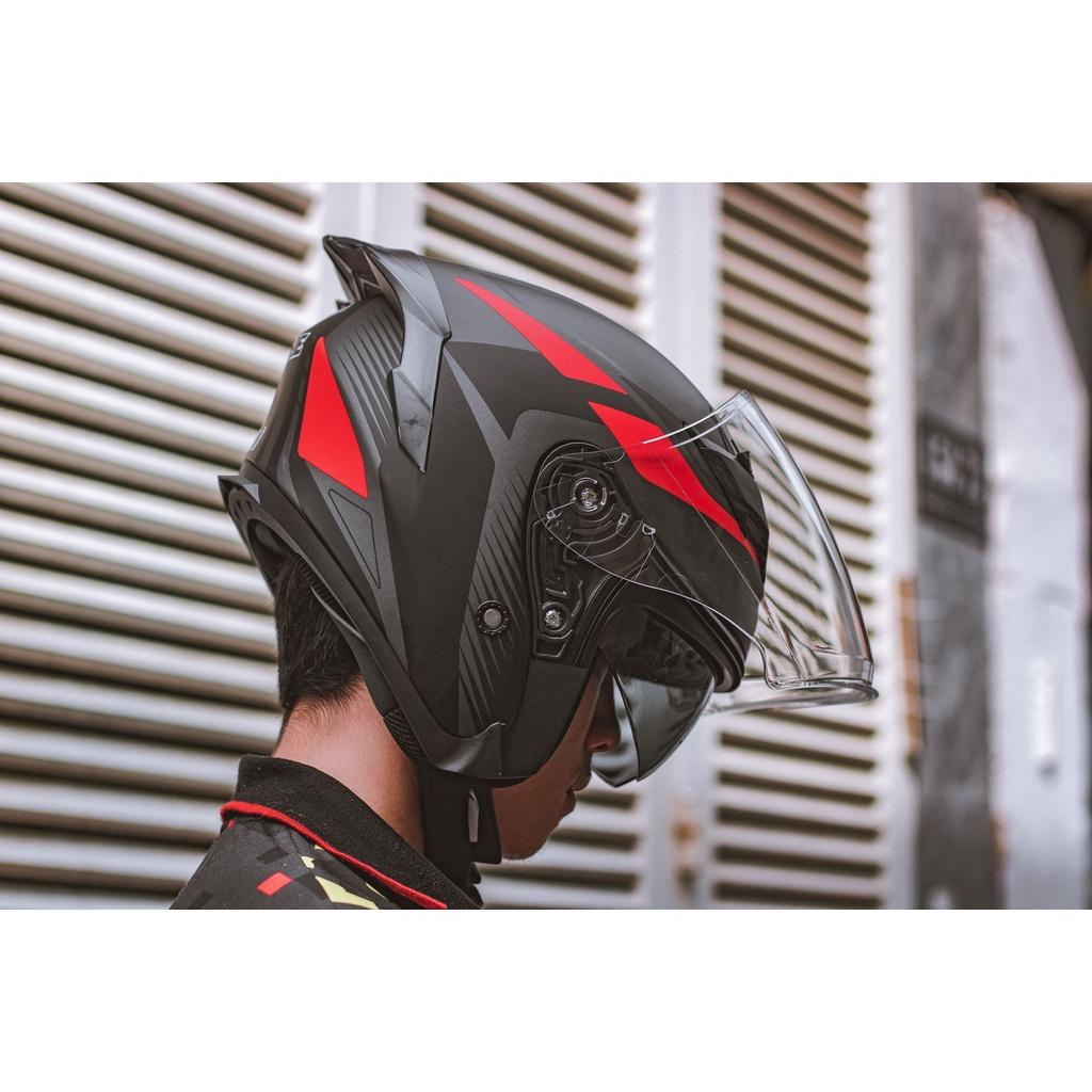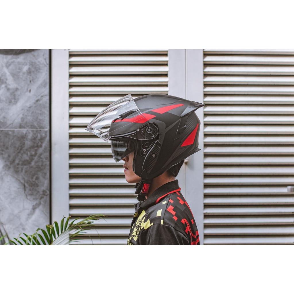 Mũ bảo hiểm được trang bị lớp kính giấu bên trong, có thể kéo ra giấu vào tùy theo nhu cầu sử dụng. Ngoài ra, nón còn đính kèm 3 khuy bấm phía trên mũ,