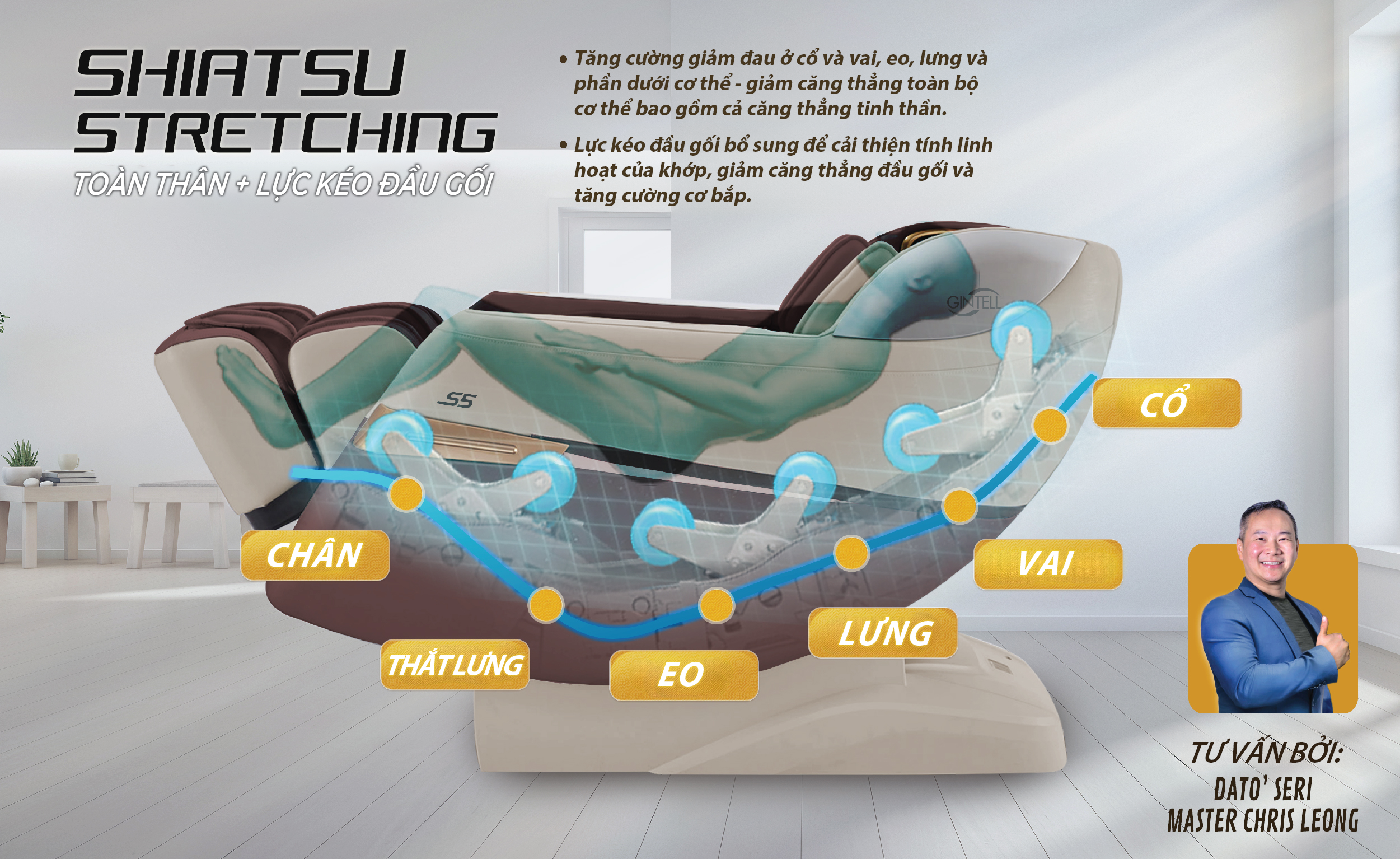 GHẾ MASSAGE GINTELL S5 SUPERCHAIR * TÍNH NĂNG NỔI TRỘI * Chức năng điều khiển giọng nói: Đơn giản hoá các bài điều khiển massage. Chế độ giãn cơ Shiatu: Kéo giãn khớp xương