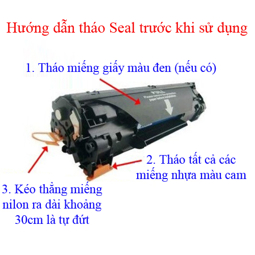 Bước 1: Lấy hộp mực cũ ra Bước 2: Bên tay trái hộp mực có miếng siêu màu vàng hoặc trắng từ từ rút ra hết. Bước 3: Bỏ vào máy in, test khoảng 3 tờ sau đó sử dụng bình thường.