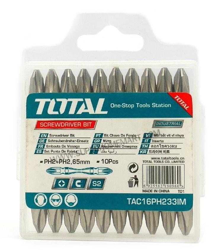 Thông số kĩ thuật -Mã sản phẩm: TAC16PH203IM, TAC16PH273IM -Nhà sản xuất: Total TAC16PH203IM PH2+PH2,45mm,10 cái/bộ, Thép công nghiệp S2, 2 đầu mũi vít, đóng gói trong họp nhựa - 100bộ/T TAC16PH273IM PH2+PH2,150mm,10 cái/bộ, Thép công nghiệp S2, 2 đầu mũi vít, tua vít xoắn, đóng gói trong họp nhựa - 100 bộ/T