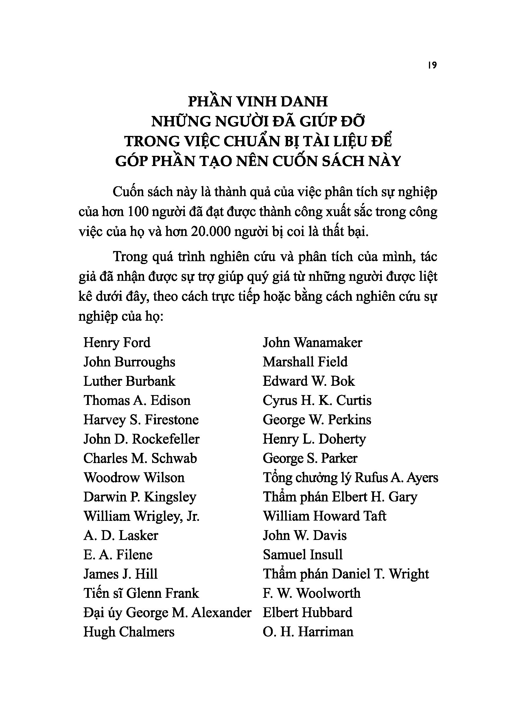 Có cả một kho báu tri thức được khai quật trong cuốn sách này. Napoleon Hill đưa ra một lộ trình ngắn gọn, chi tiết để đi lên nấc thang dẫn tới thành công, một bước tiến phụ thuộc vào việc tổ chức các quy trình tư duy của một người. Có lẽ đọc cuốn sách này, bạn sẽ tìm thấy một trong những thứ quan trọng để xoay chuyển cuộc đời mình sang hướng khác – hướng của một cuộc đời thành công, ví như: xác lập mục tiêu, bồi dưỡng sự tự tin, hình thành thói quen tiết kiệm, tạo dựng tính chủ động, tự chủ, phát huy khả năng tưởng tượng, giữ lửa nhiệt tình, giữ vững sự tập trung, xây dựng khả năng hợp tác, rút ra kinh nghiệm sau thất bại, khoan dung với mình và mọi ngườ