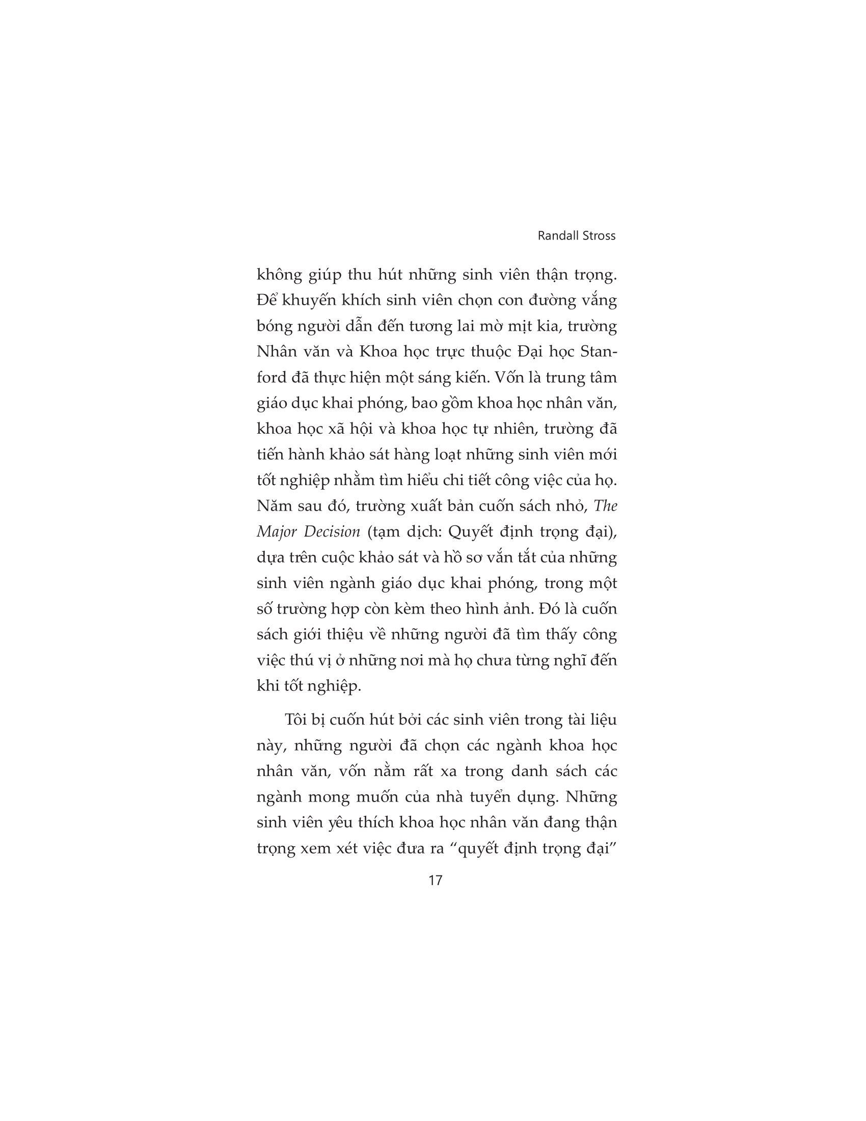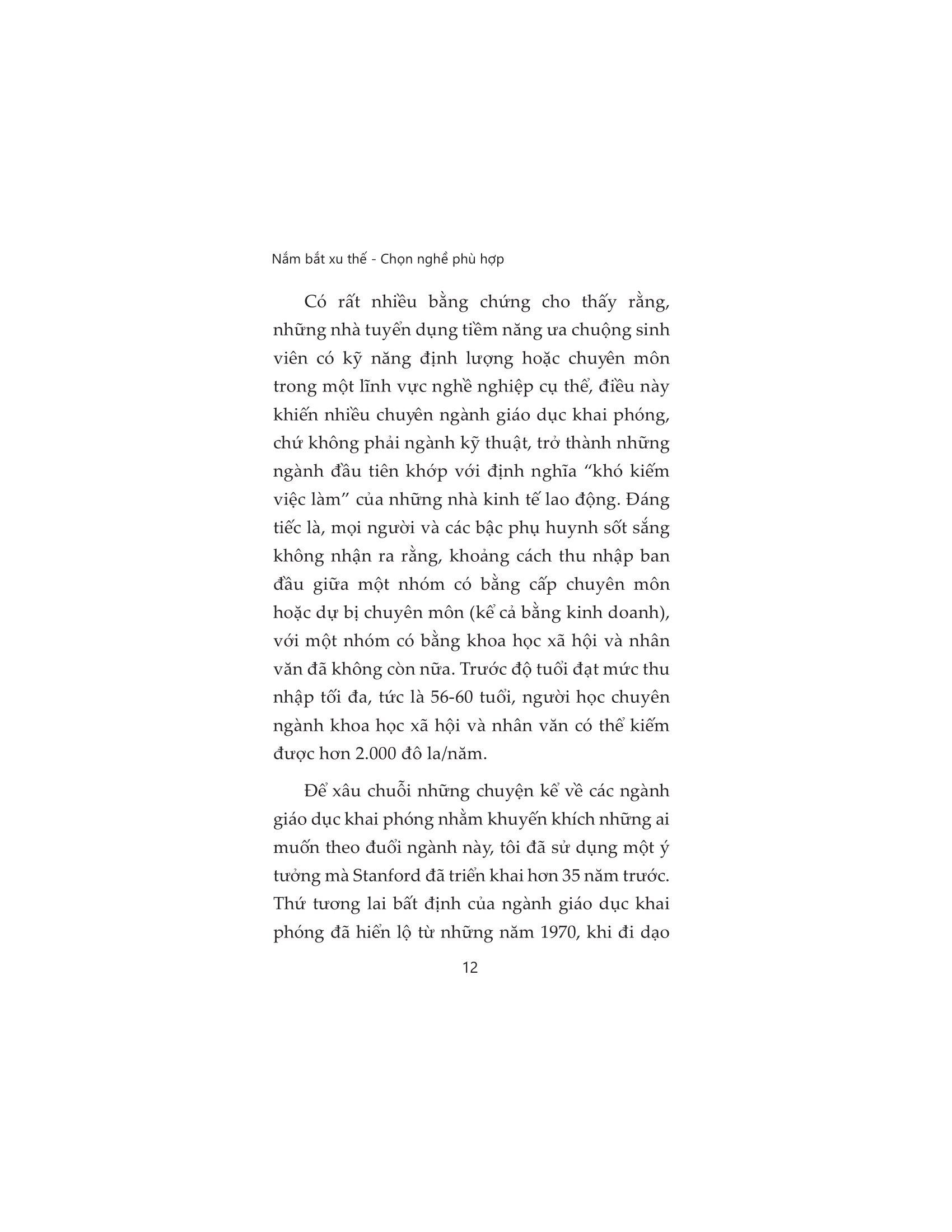 Bất kể ngành học mà bạn muốn hoặc đang theo đuổi là gì, nếu như bạn cảm thấy hoang mang về cuộc sống hậu đại học và muốn trang bị cho bản thân những kỹ năng nghề nghiệp tốt nhất ngay từ bây giờ, hãy bắt đầu bằng cách đọc Nắm bắt xu thế - Chọn nghề phù hợp. Những câu chuyện thực tiễn trong cuốn sách này sẽ cung cấp những lời khuyên và giúp bạn tự rút ra những điều cần làm, ví dụ như tham gia các kỳ thực tập ngay từ năm hai hay xây dựng mạng lưới quan hệ với các cựu sinh viên. Bạn sẽ vừa có thể theo đuổi đam mê tri thức, vừa tích lũy được những kỹ năng mềm và kỹ năng chuyên môn thiết thực để sẵn sàng đối mặt với tương lai bất định.