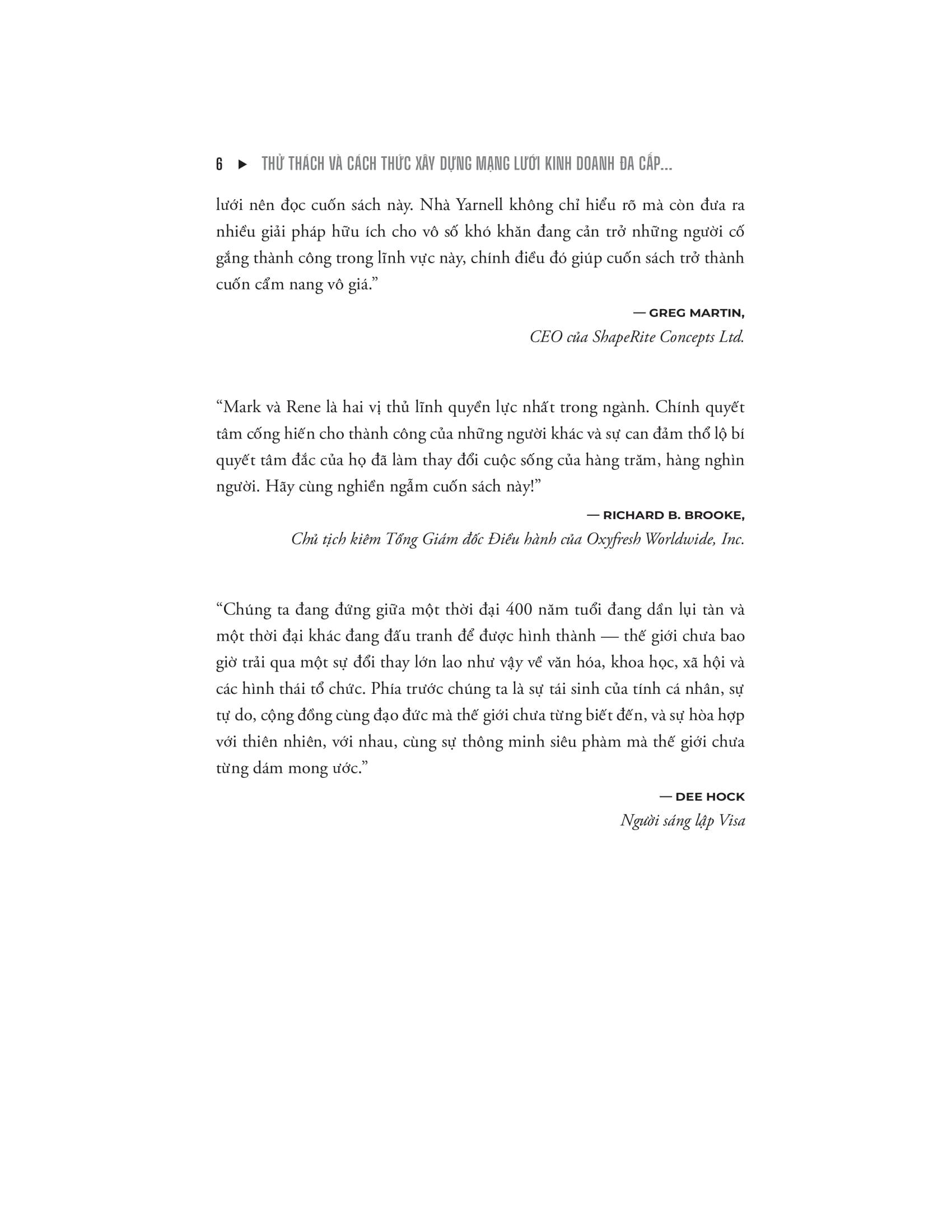 Với cả cuộc đời tham gia, đào tạo và huấn luyện tuyến dưới trong ngành kinh doanh mạng lưới rồi đạt được thành công vang dội trong ngành này tại nước Mỹ, Mark Yarnell và Rene Reid Yarnell sẽ giúp bạn tránh khỏi những cạm bẫy và sai lầm, đồng thời chỉ ra con đường đúng đắn giúp bạn đạt được tự do tài chính và tận hưởng khoảng thời gian tự do để ở bên những thân yêu, hay làm bất kỳ điều gì bạn mơ ước.