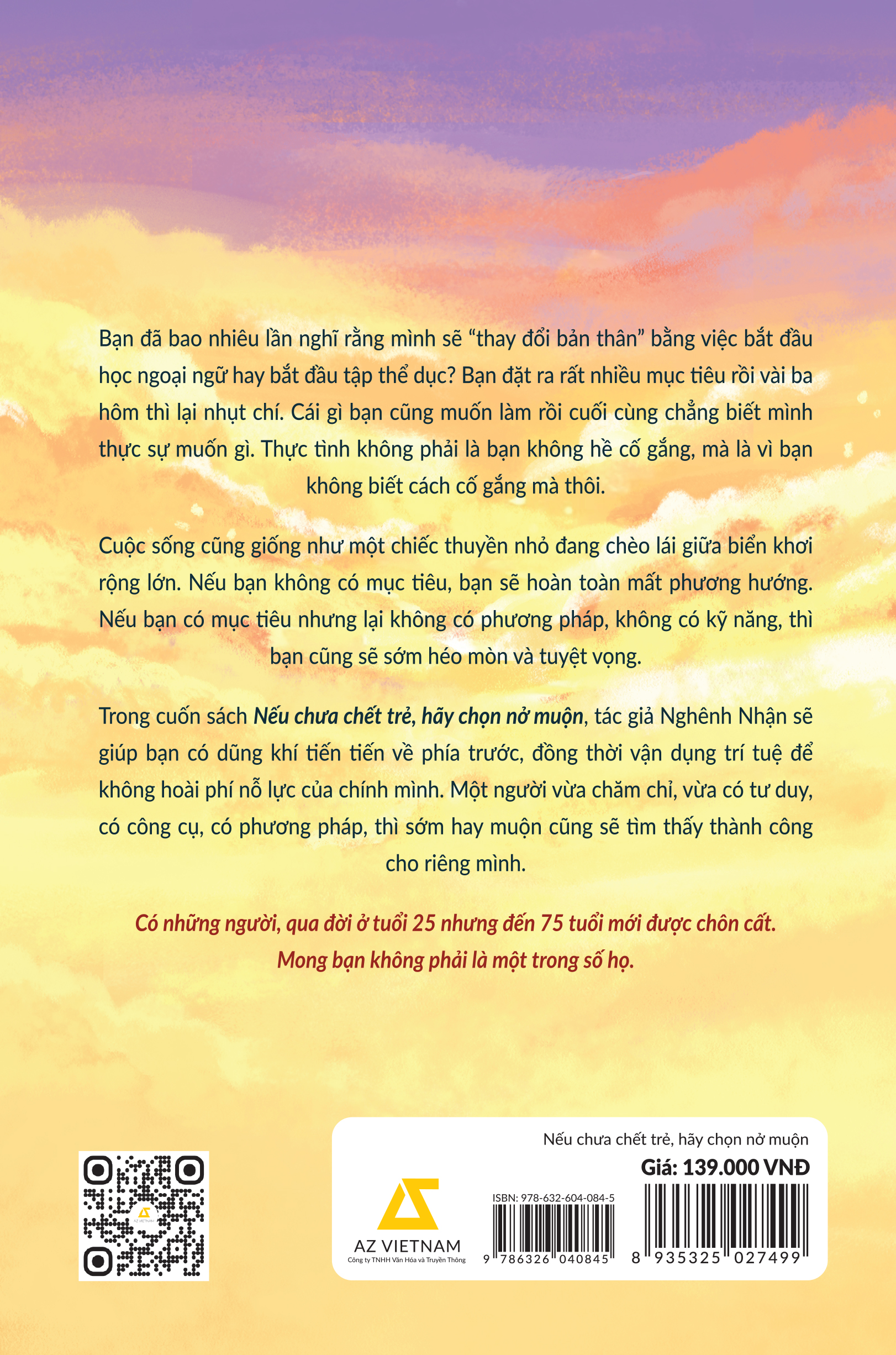Trong cuốn sách Nếu chưa chết trẻ, hãy chọn nở muộn, tác giả Nghênh Nhận sẽ giúp bạn có dũng khí tiến tiến về phía trước, đồng thời vận dụng trí tuệ để không hoài phí nỗ lực của chính mình. Một người vừa chăm chỉ, vừa có tư duy, có công cụ, có phương pháp, thì sớm hay muộn cũng sẽ tìm thấy thành công cho riêng mình.
